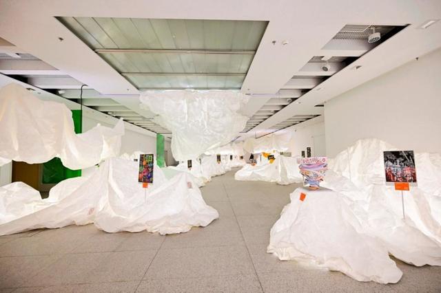 步入展厅,只见“虚山水”装置将人们引领至一个梦幻空间。白色半透纸质材料贯穿展厅全场,通过裁剪、褶皱、堆叠、悬挂等方式塑形,让人仿佛置身于穿越时空后的超现实虚构世界,以此呼应“打开时间之门”的展览主题。这一特别的展陈设计由著名工业设计师杨明洁带来,并且实现了突破性的绿色创新,开创性地全面采用100%可循环可再生材料,构建起一个真正意义上的“零废弃”布展范式。