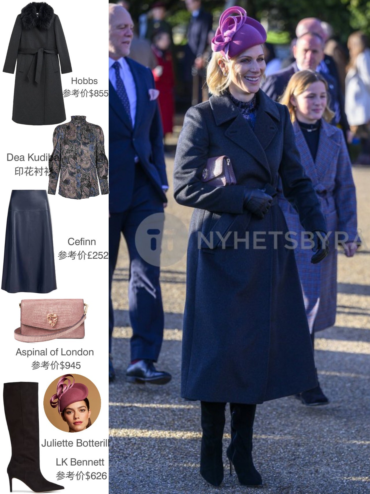 2025圣诞日LOOK~依旧是全员大衣加麂皮长靴/单鞋,卡米拉和安妮是红色大衣,唯一和她俩呼应上圣诞红配绿色系的是玛格丽塔(图十二·玛格丽特公主孙女)~其余多选择了深色系(海军蓝or棕色系),扎拉一家都偏海军蓝,米娅又是Max&Co的大衣,妹妹Lena则穿的Monsoon的海军蓝军装风大衣(表姐萨凡纳和亲姐Mia都穿过)。相比于往年,感觉今年着装上圣诞的氛围感没那么浓~英国王室王室时尚