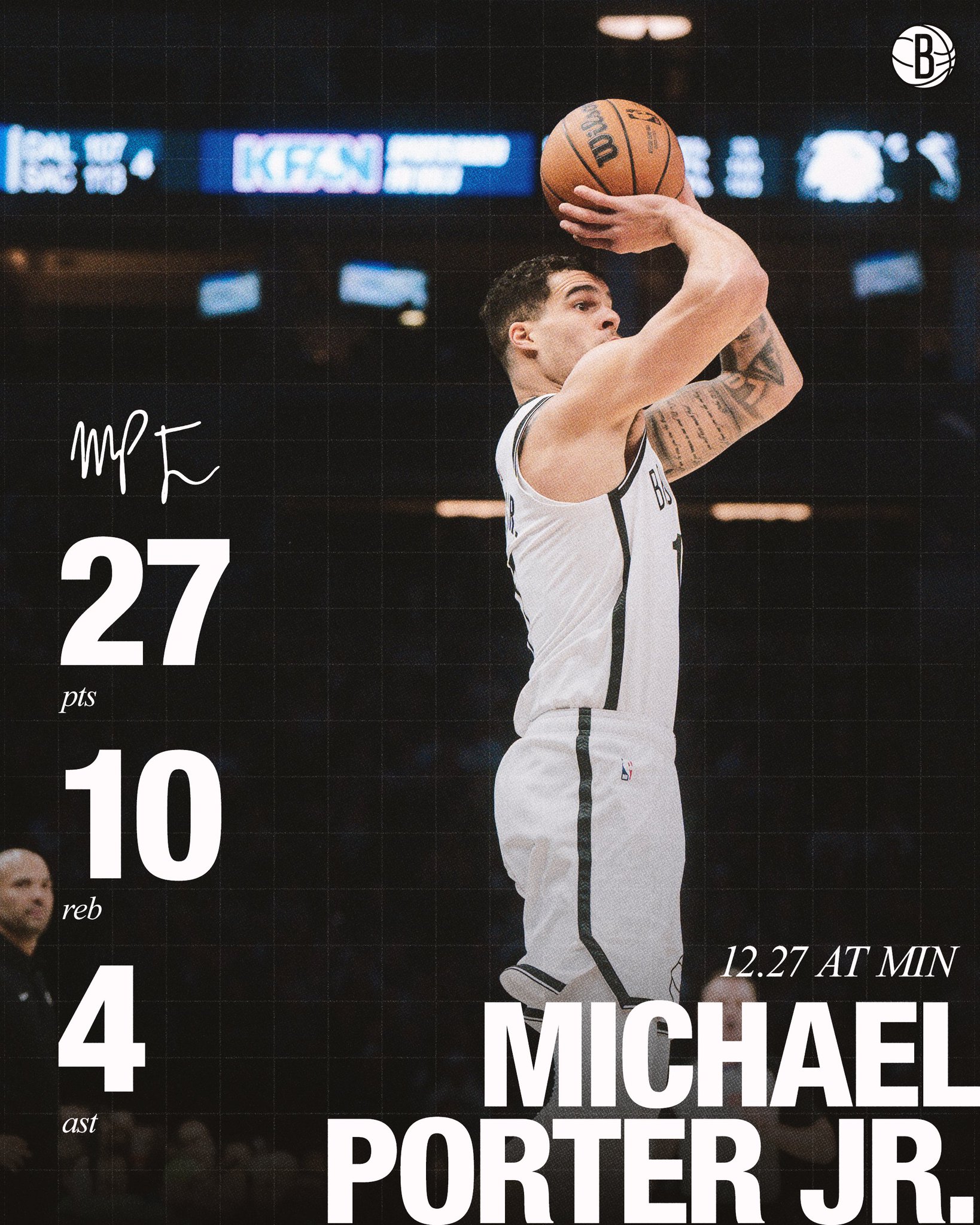 篮网球员迈克尔-波特全场出战33分钟,16投9中,三分8中4、罚球5中5得到27分10篮板4助攻。