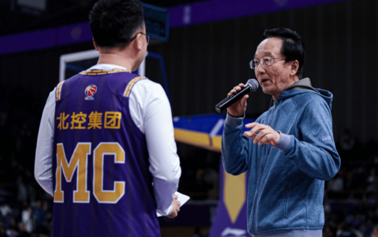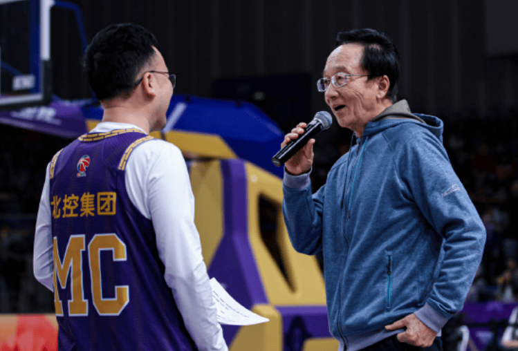 配文道:欢迎孙正平老师莅临北控主场,著名体育赛事解说员孙正平老师昨晚也来到奥体中心观看比赛,现场解说过无数赛事的他,用声音勾勒了几代人的美好赛场回忆,观赛之余,孙老师为北控男篮送上了祝福。