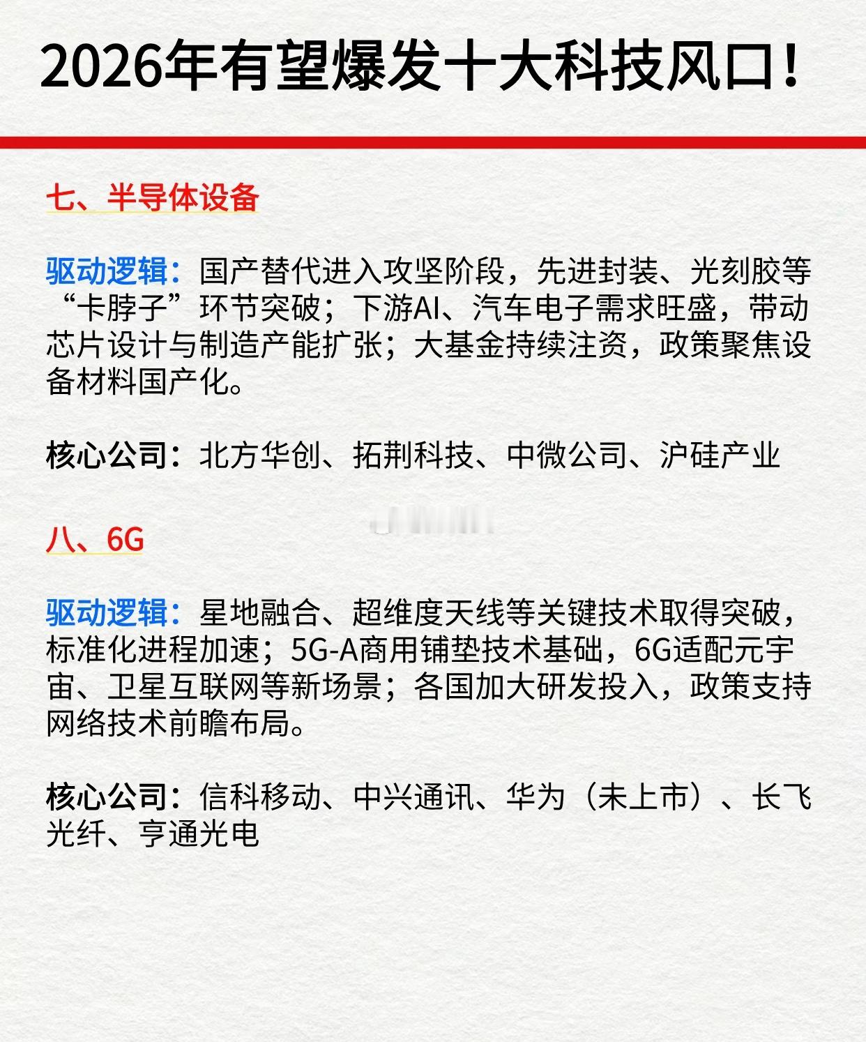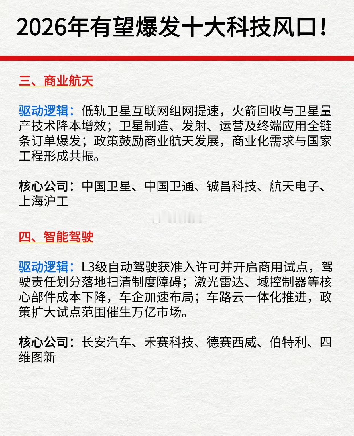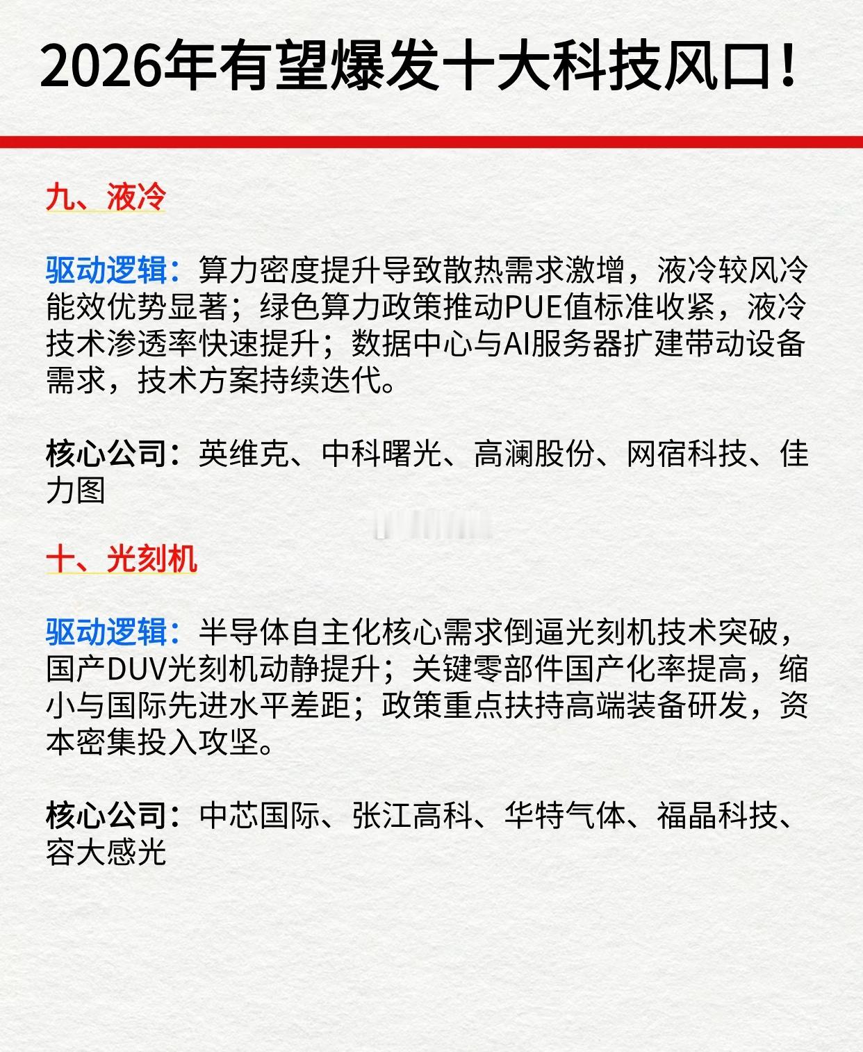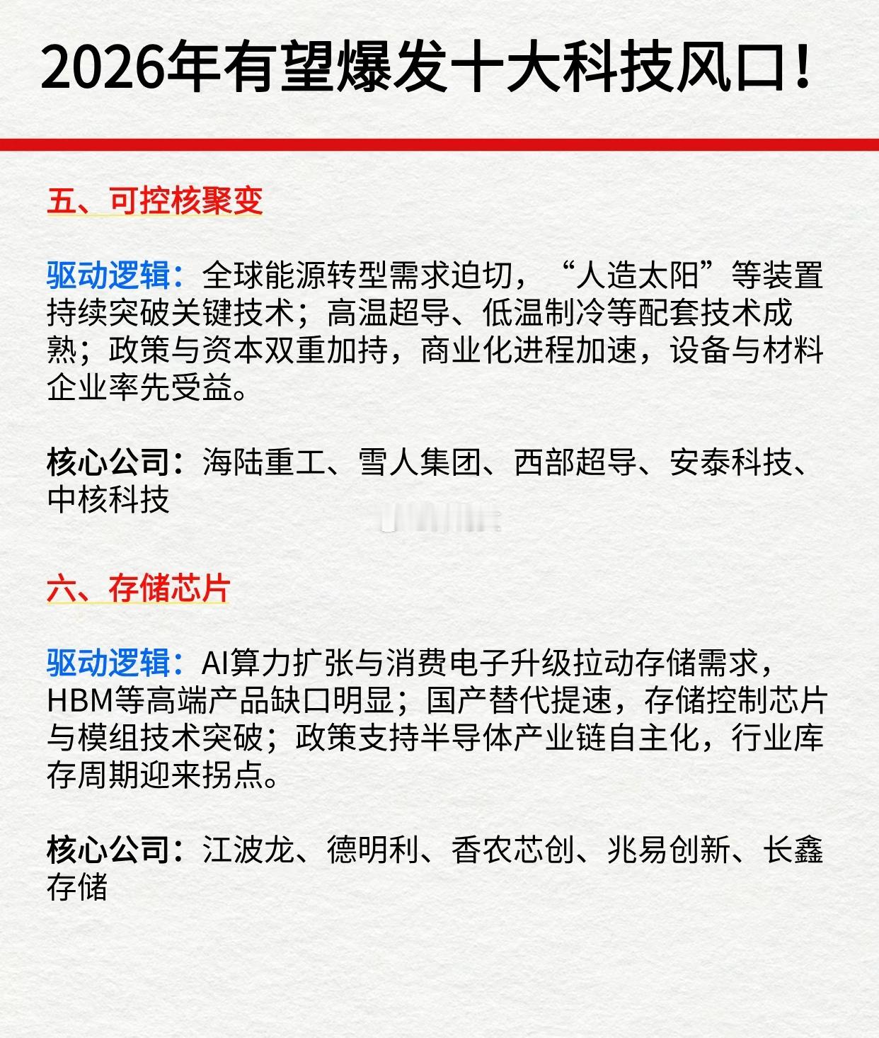2026年有望爆发的十大科技风口,每部分均含驱动逻辑+核心公司1. 人形机器人:核心零部件突破、AI赋能、政策支持;代表公司绿的谐波、汇川技术等。2. AI算力:大模型迭代需求、“东数西算”、大基金支持;代表公司寒武纪、中际旭创等。3. 商业航天:低轨卫星组网提速、火箭回收降本;代表公司中国卫星、中国卫通等。4. 智能驾驶:L3准入商用、部件降本、车路云推进;代表公司长安汽车、禾赛科技等。5. 可控核聚变:能源转型、“人造太阳”技术突破;代表公司海陆重工、西部超导等。6. 存储芯片:AI算力拉动、国产替代、库存拐点;代表公司江波龙、兆易创新等。7. 半导体设备:国产替代攻坚、大基金注资;代表公司北方华创、中微公司等。8. 6G:星地融合等技术突破、适配新场景;代表公司信科移动、中兴通讯等。9. 液冷:算力散热需求、绿色政策推动;代表公司英维克、高澜股份等。10. 光刻机:半导体自主化倒逼突破、国产DUV进展;代表公司中芯国际、张江高科等。