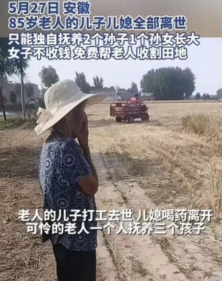 “眼泪止不住了!”安徽,美女农机手给 85 岁老人割麦时,得知老人的儿子儿媳全部离世,而她独自抚养 2 个孙子和1 个孙女长大,顿时心生同情,决定分文不收!女子:“这还收什么钱啊!这对我来说都不是事,但对她老说可能会很难!” 原来,这位85岁的老人,独自承担着供养两个孙子、一个孙女的重任。她种下的这几亩麦子,不仅是生活的希望,更是孩子们未来的寄托。小潘突然觉得手中的饭盒变得异常沉重,她转身从车里拿出泡面和火腿肠,塞到老人手里:“您先吃点东西,我给您割,几分钟就好。” 老人连连推拒,声音里满是无奈:“使不得,我没钱啊……”小潘眼眶通红,她深知,对于这位老人来说,每一分钱都凝聚着血汗,都承载着家庭的重量。但她更清楚,此刻的帮助,对老人而言,可能是天大的难关。于是,她坚定地说:“这还收什么钱!对我是顺手,对您,可能是天大的难。” 小潘的话,不仅是对老人的安慰,更是对人性善良的诠释。在这个麦收时节,她用自己的行动,为这位孤独的老人撑起了一片天。而这份温暖与力量,也将随着麦浪的起伏,传递到更远的地方。她竟径直跳上收割机,引擎的轰鸣声瞬间撕裂了田野的宁静!烈日高悬,那抹蓝色身影在金色麦浪中疾驰,似一道无法阻挡的洪流,所过之处,麦子纷纷倒下。 老人呆坐在田埂上,望着那片以惊人速度消失的麦子,泪水不受控制地夺眶而出。这每一株麦子,都倾注了他无数的心血与汗水,从播种时的满怀期待,到生长过程中的精心呵护,再到如今即将收获的喜悦,每一步都饱含着他的艰辛。可如今,这收割的场景却让他百感交集。 麦子收割完毕,小潘没有收取老人分毫费用,便默默转身离开。她留下的,是一片被整理得平平整整的田野,那整齐的麦茬,仿佛是她无声的承诺与付出。而老人,望着她远去的背影,心中感激之情如潮水般翻涌,却只能默默伫立,用无声的眼神,送别这位给予他帮助的善良之人。这一片田野,见证了一场温暖的相遇,也留下了关于善良与感恩的动人故事。