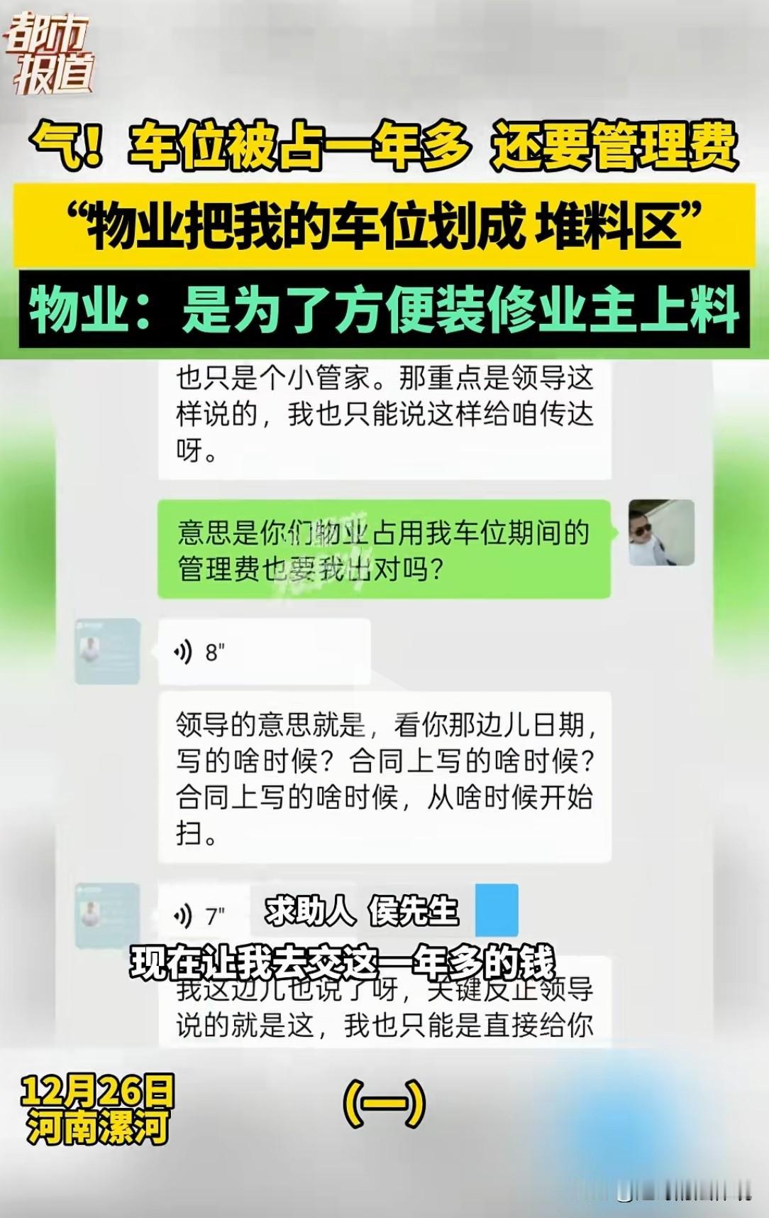 河南漯河,男子在某小区买的房子一直没住,同时买的车位也一直空着,他想搬家,物业让他交车位管理费,否则不给录车牌信息,车辆进不了车库。男子得知,自己的车位一直被物业占用,不但1分钱不给,反而让他交被占用期间的管理费,不交不让进小区回家。男子怒斥:这简直是强盗逻辑! 侯先生买了一套新房,同时也买下了A0899的车位。 房子装修好后一直没住,车位也一直空着。 最近他们准备搬到新房子里住,过一个欣欣向荣的春节。 可他现在却被小区物业拦在小区外面,连家都不让她回,而原因更是让人哭笑不得。 侯先生想搬新家,开车拉着被子啥的就要进车库,可被车库的栏杆拦下,因为他没有录入车牌信息,识别不了。 侯先生赶紧去办理车牌录入,物业不给办,因为他的车位管理费一直没交。 侯先生这才了解到,自家的车位竟然铺了一大块钢板,墙上写着“卸料区”3个字。 他问物业,我的车位为啥成了卸料区,是谁占的?物业让他去找管家。 管家称,卸料区是物业为装修的业主准备上料的地方。 侯先生得知,自己的车位已经被物业占用了一年多。 他问管家,车位被物业占用,连声招呼都不打,凭啥? 那是我真金白银买下的,一天都没用。 管家称,不管谁用,但管理费需要你按合同上的时间交费。 侯先生急了,物业占用了我的车位,虽然他没打招呼,我也没追究。 但有一点我没明白,他白白占用了一年多,为啥让我交这一年的管理费? 如果我收了他的租金或者补偿,还说得过去,可这事我压根不知道! 请问,物业咋好意思开口找我要管理费? 但管家称,自己只是传达物业的意思,并做不了主,让侯先生去找物业。 就这样,侯先生被当做皮球又踢回了物业。 侯先生再次找到物业,但不交管理费仍然不给他录车牌信息。 但第二天,物业撤走了侯先生家车位上的钢板。 侯先生当天开车拉着被子进地下车库,仍然进不去,甚至连家都回不了了。 他很纳闷,自己100多万买的房子,却回不了家? 交费请来的小区物业,却把业主拦在小区外面,这是啥道理? 胡先生再三交涉,物业仍是那句话,必须先把管理费交了,才给他的车录入信息, 否则他是回不了家的。 眼看自己搬家受阻,侯先生联系了媒体。 记者赶到的时候,侯先生正在小区东门,车停在车库门口进不去。 记者尝试和工作人员沟通,看能不能通过现场登记,让侯先生回家,但未能解决。 同时另一位业主的车回家拉东西,也被拦在外面,物业让他用板车进小区去拉货,但车不能进。 业主买了房子,连回家的权利都没有? 在记者的建议下,侯先生报警。 民警称,管理费和下地下车库是两码事,如果业主欠物业钱,他们可以去起诉,但不能不让业主回家。 因实质问题没有解决,记者随后跟随侯先生来到物业了解情况。 再侯先生的质问下,物业承认占用了他的停车位。 但侯先生问到,你们用了一年多,凭啥让我来掏管理费,但无人回答。 侯先生急了:你们这一套就是强盗逻辑! 工作人员表示,现在就在解决问题,侯先生忍无可忍:你们给我解决的啥? 我等着搬家,拉着被子都不让放回家,你们给我解决啥了? 记者也提出,为啥物业把卸料区设置在侯先生家的车位?征得业主的同意了吗? 工作人员称,交房时为了方便业主装修上料,在每个单元口找到一个比较近的位置,但当时并不知道车位是侯先生的。 记者指出,占用业主的车位,应先主动给业主打招呼,这是最起码的尊重。 物业的口气这才软下来,称他们尽快向上级反映,解决侯先生的问题。 侯先生称,如果物业仍坚持,由他承担当年的管理费,就去法院起诉,法院判自己交多少钱,自己听从判决。 《民法典》第236条:妨害物权或者可能妨害物权的,权利人可以请求排除妨害或者消除危险。 侯先生购买了车位,对该车位享有所有权,物业未经其同意,将其车位作为卸料区占用一年多,属于妨害侯先生物权的行为。 侯先生有权要求物业排除妨害,即让物业停止占用车位,恢复车位原状,使其能够正常使用车位。 《民法典》第944条:业主应当按照约定向物业服务人支付物业费。物业服务人已经按照约定和有关规定提供服务的,业主不得以未接受或者无需接受相关物业服务为由拒绝支付物业费。 业主违反约定逾期不支付物业费的,物业可以催告其在合理期限内支付; 合理期限届满仍不支付的,物业服务人可以提起诉讼或者申请仲裁。 物业服务人不得采取停止供电、供水、供热、供燃气等方式催缴物业费。 如果物业提供了清洁等服务,侯先生则应当支付车位管理费。 但物业以未交管理费为由,拒绝为侯先生录入车牌信息,阻止其车辆进入车库回家。 这属于采取不当方式催缴物业费,违反了上述法律法规。 不过,当天物业经过和侯先生协商决定,免去他2025年当年的车位管理费600元,双方和解。 对此你怎么看? 关注@赵哥的法律观,明辨是非,不上当。