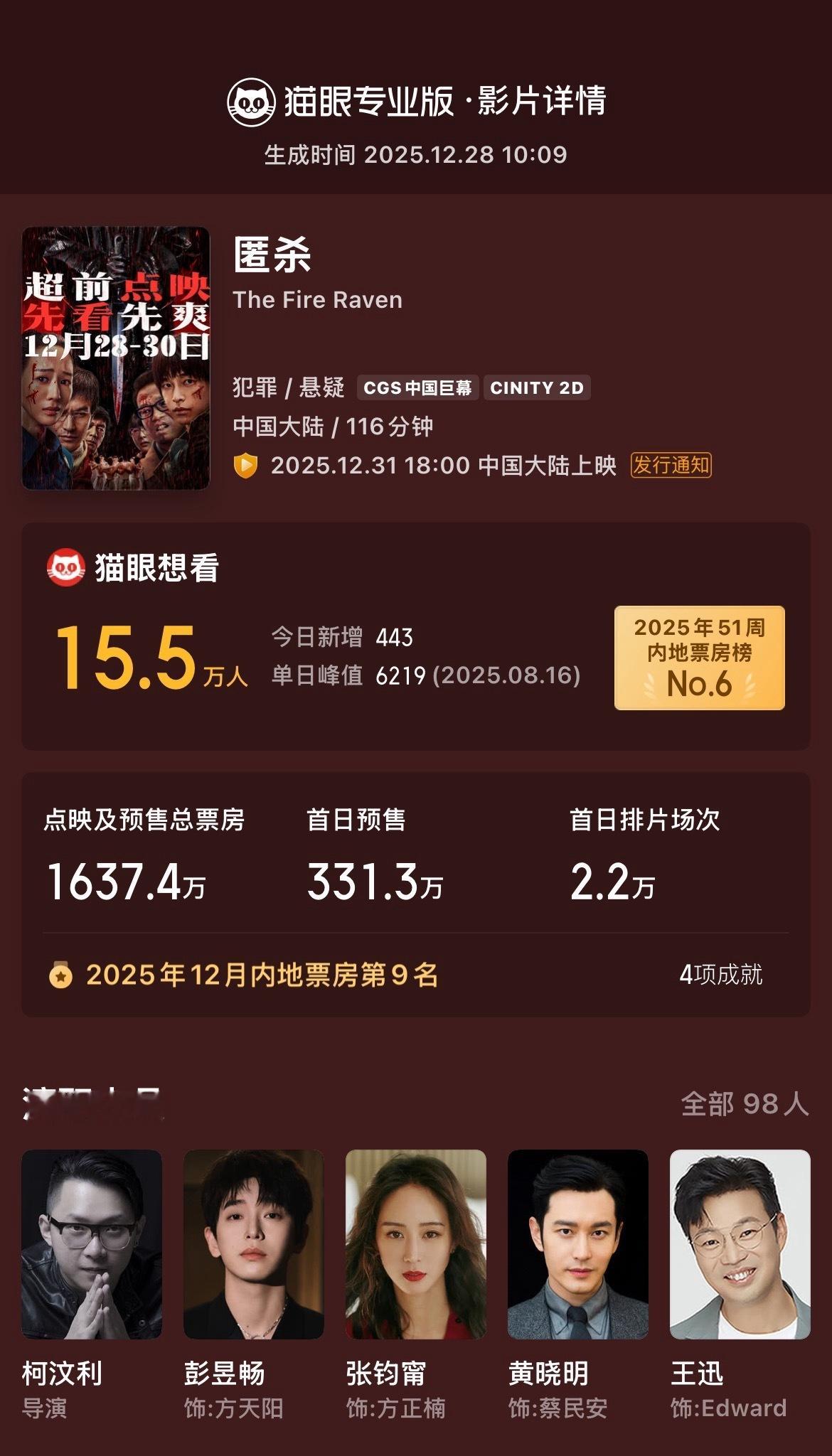 肖战连包5场支持匿杀 据猫眼专业版云包场显示,包场支持电影《匿杀》。该电影将于12.31上映,截至目前点映及预售总票房超1637万。