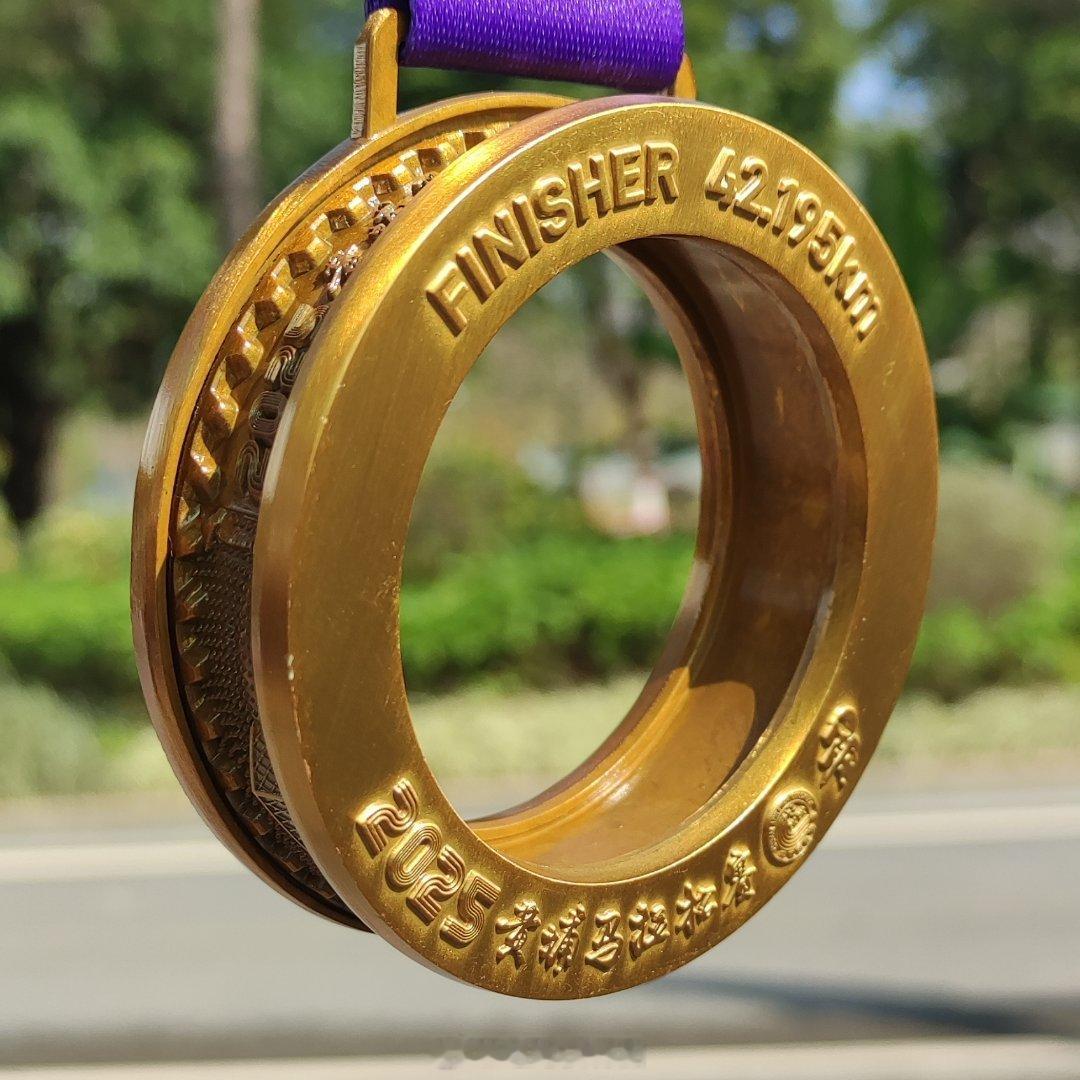 2025广州黄埔马拉松完赛包和奖牌。发拖鞋让我这种存包放拖鞋的显不出自己聪明了奖牌略重,如果能解决前后不平衡的问题就更好了。跑步广州黄埔马拉松赛事组织 广州·中新广州知识城九龙湖