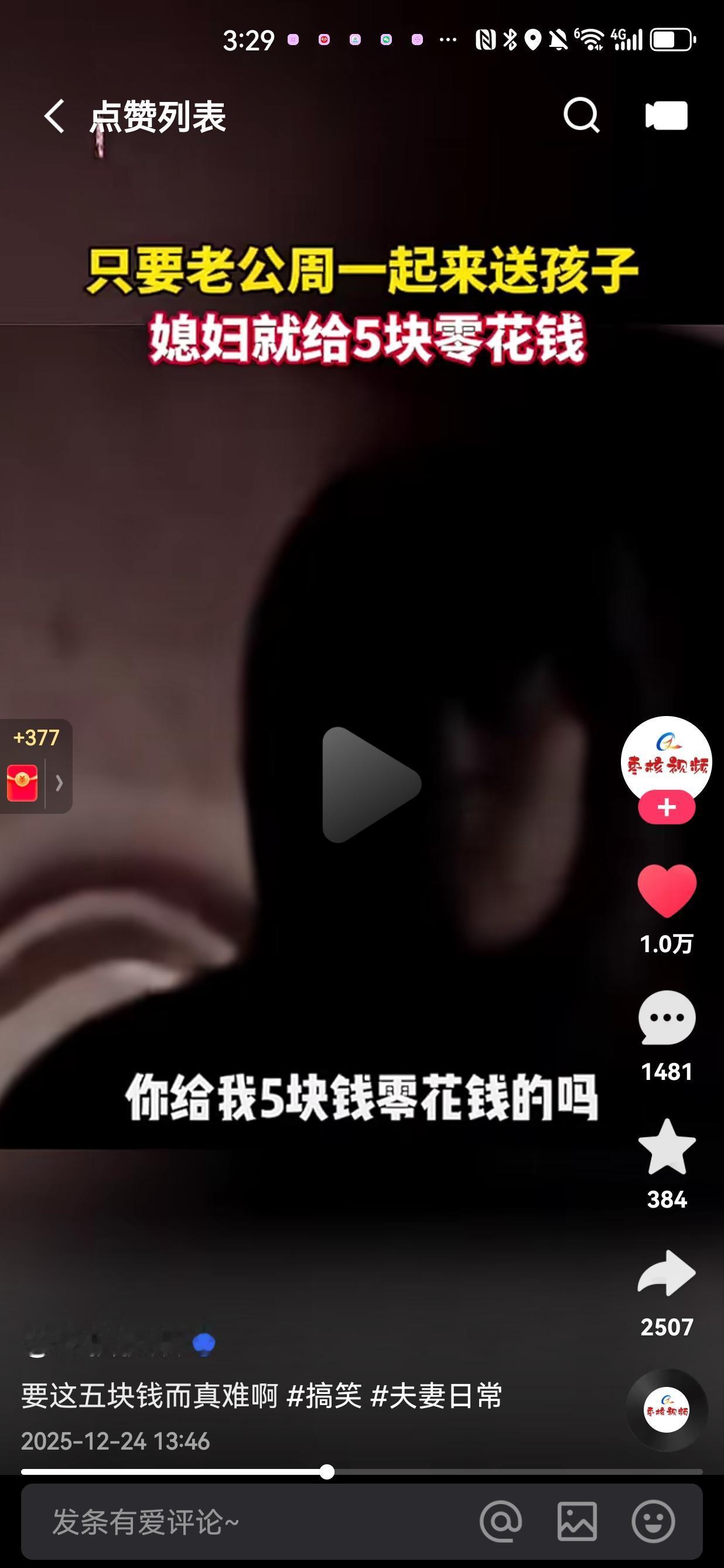 好惨一男的!不过也是周瑜打黄盖——一个愿打一个愿挨。山东一男子为了5块零花钱,真的是拼了!周一早早起床,送娃上学换零钱,网友:这家庭地位我熟,我在家也是如此! 山东,一大老爷们问媳妇要“零花钱的名场面”彻底火出圈了!12月22号那天,有个大哥因为周一早起送娃,眼巴巴地追着媳妇要5块零花钱的对话,把全网网友笑得直拍大腿,更戳中了无数已婚男女的日常,简直就是世另我啊! “你不是说好了嘛,周一我起来送孩子,给我5块钱零花钱!”“快给我呗!”视频里大哥软磨硬泡的语气,活脱脱就是个等着家长发糖的小屁孩,再配上那“见钱眼开”的小狗表情包,这反差萌直接拉满!就为了这5块钱,这位大哥愣是把“家庭地位”四个字演得明明白白。 网友看到后评论道:“这五块钱,拿得比挣一个月工资还费劲!”老话都说的好“一分钱难倒英雄汉”,这话搁这儿可算是应验了! 别看就5块钱的小事儿,里头藏的全是夫妻间的小情趣。有人说这是“妻管严”,可在这打打闹闹的讨要里,全是烟火气的温柔——媳妇用5块钱的小约定,把老公拽进带娃的日常。 老公嘴上喊着“太难了”,身体却诚实得很,这一来一回的拉扯,可比甜言蜜语戳心窝子多了!“打是亲骂是爱,不打不骂不自在”,说的可不就是这种小日子嘛! 其实,好多已婚家庭都是这种德行,生活可不就是这样吗?哪有啥惊天动地的浪漫,全是柴米油盐里的小打小闹。 可能是为了几块零花钱的“斗智斗勇”,可能是一起送娃路上的家长里短,这些看着不起眼的小瞬间,才是婚姻最真实的模样。 就像有网友说的:“我家那位也一个样,为了十块钱跑腿费,能把小区里所有快递都扛回家,嘴上嫌弃得不行,心里甜滋滋的。” 毕竟,我们都说“夫妻没有隔夜仇,床头吵架床尾和”,这点小打小闹,也不过是生活的调味剂罢了! 5块钱买不来啥贵重玩意儿,却能买来一家子的欢声笑语。说到底啊,婚姻里最珍贵的从来都不是钱,是那个愿意陪你闹、陪你笑,哪怕为了五毛钱都能跟你拌半天嘴的人!“百年修得同船渡,千年修得共枕眠”,能遇上这么个愿意陪你折腾的另一半,才是这辈子最赚的买卖! 大家觉得呢?欢迎大家评论区讨论。