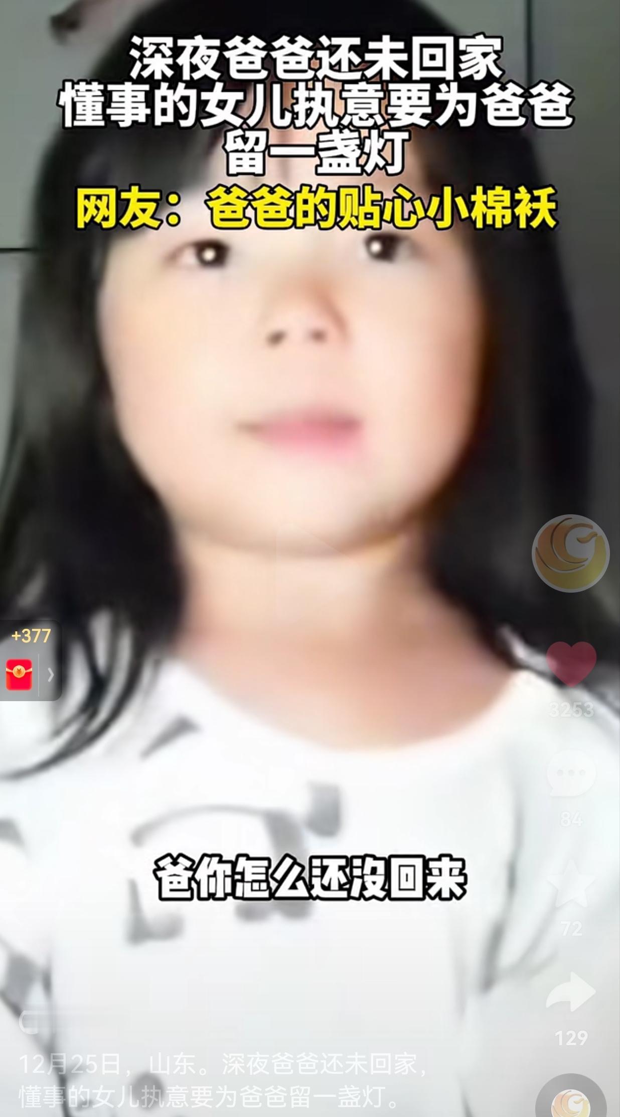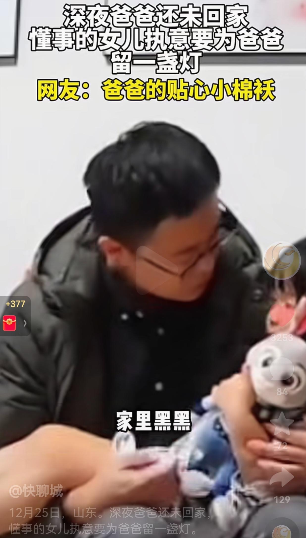 这闺女没白疼!山东,一闺女深夜等待爸回家,尽管困得都睁不开眼睛了,还非要给爸爸留灯,这一幕戳中千万爹妈的心窝子。 12月25号山东大半夜,一段小姑娘等爸爸回家的视频,直接把全网网友看哭了! 妈妈太困了,实在熬不动了,就睡得呼大睡了。只见萌娃抱着毛绒玩具,孤零零蹲在昏沉沉的屋里,对着视频电话一遍又一遍问:“爸爸咋还不回来啊?”还念叨着要给晚归的爸爸留盏灯,那句软乎乎的“开车别着急”,看得人心里酸溜溜的。 等爸爸终于推门进屋,蹲下来心疼地摸她脑袋:“你咋还不睡啊?” 小姑娘奶声奶气地说:“我怕你一进门,家里黑乎乎的,以为没人等你呢!”就这一句话,网友们全破防了:这才是爸爸的贴心小棉袄,暖得人鼻子直发酸! 老话讲“闺女是爹的小棉袄,暖身又暖心”,这话搁这儿算是说到心坎里了。 这娃明明还是个要人哄着的小不点,却学着大人的模样惦记爸爸。爸爸在视频里问她“咋还没睡”,她乖乖回:“妈妈睡着了,我要等爸爸回来!” 爸爸催她先去睡,她犟得像头小牛:“我不!我等你!”还不忘补一句“开车别着急”。 等爸爸回到家,一把将她搂进怀里,轻声说“爸爸知道啦,安安一直在等我”,又温柔哄着“咱睡觉去咯”,这简简单单的一个拥抱,啥漂亮话都没有,却把孩子对爸爸最纯粹的惦记、爸爸对孩子最细腻的疼,揉得又软又暖。都说“血浓于水”,这亲子间的牵挂,真就是刻在骨子里的。 老话说的好“女儿是爸爸的小棉袄”,这话真不假!可这份暖从来都不是单向的。 爸爸在外头,风里来雨里去,为一家人打拼,不就是想给孩子撑出一片天嘛。孩子就用最稚嫩的法子回应,把满心的惦记,变成深夜里的一盏灯、一句软乎乎的叮嘱。 这盏灯啊,不光是给晚归的爸爸照亮家门,更是照进成年人累得直不起腰的日子里的一束光——原来我们拼了命去努力,意义全藏在这些碎碎的、暖暖的小牵挂里。 毕竟“金窝银窝,不如家里的草窝”,家里有人等、有灯亮,才是最踏实的幸福。 这年头日子过得贼拉快,我们天天忙着赶路、忙着赚钱,常常把身边最实在的幸福给忘了。 可能是孩子随口一句关心,可能是家人深夜留的那盏灯,这些看着不起眼的小瞬间,才是撑着我们熬过那些难捱日子的底气。 老话说“细水长流的陪伴,才是最真的情”,就像这个叫安安的山东小姑娘,她不懂啥叫生活压力,却用最直白的爱告诉我们:家人的牵挂,永远是最暖的港湾。 其实啊,爹妈和孩子的缘分,就是一场互相奔赴。我们陪着孩子慢慢长大,孩子也在用他们的方式治愈我们。 “养儿方知父母恩”,可反过来,孩子的天真与爱,也在治愈着为生活奔波的父母。这盏深夜里亮着的灯,暖了爸爸的回家路,也让我们看清了:这世上所有的美好,都比不过一家人围坐在一起唠唠嗑,家里亮着灯,等着彼此回家。 大家觉得呢?欢迎评论区留言。