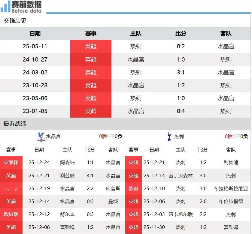 水晶宫vs热刺前瞻:伦敦难兄难弟 都不擅长攻坚战 谁也难赢北京时间12月29日凌晨00:30,英超第18轮迎来伦敦德比战,水晶宫主场迎战热刺。水晶宫vs热刺,比赛看点如下:第一:两队情况!英超17轮战罢,水晶宫7胜5平5负积26分排名第九;热刺6胜4平7负积22分排名第十四。上轮英超,水晶宫客场1-4惨败给升班马利兹联,遭遇联赛两连败,周中欧联杯点球大战不敌阿森纳出局;热刺主场1-2不敌利物浦,西蒙斯和罗梅罗两大将染红,遭遇联赛两连败,近8轮联赛仅有1胜。第二:伦敦难兄难弟,都不擅长攻坚战,谁也难赢!水晶宫虽然占据主场的地利人和,但一周双赛,球员较为疲惫,球队只会反击战一种踢法,面对破密集的比赛,没有好的战术支撑。热刺客场作战,西蒙斯和罗梅罗两大主力还要停赛。两支联赛两连败的伦敦球队相遇,或许谁也难赢,一场平局,止住联赛两连败,或许两队都可以接受吧!双方近6次交手,2胜4负,处于下风。上赛季水晶宫主客场双杀热刺,但再往上2个赛季,热刺对水晶宫完成四连杀。双方伤停情况:水晶宫有杜库雷、里亚德、镰田大地、科波哈、穆尼奥斯、理查兹;热刺有麦迪逊、库卢、罗梅罗、索兰克、西蒙斯、乌多吉、高井幸大。