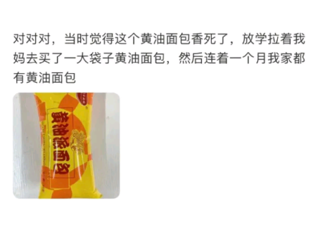 当时觉得这个黄油面包香死了,放学拉着我妈去买了一大袋子黄油面包,然后连着一个月我家都有黄油面包