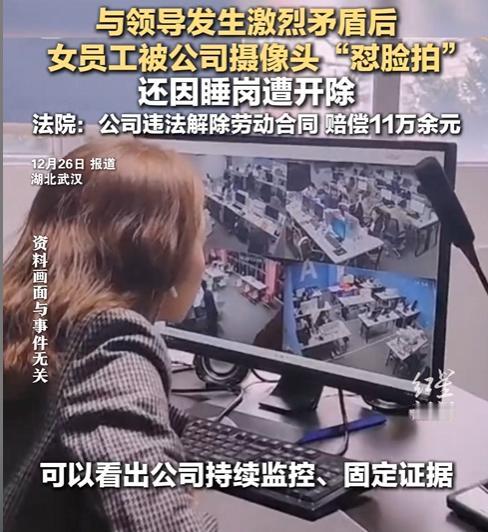 职场公报私仇有多恶心?武汉这家公司的操作,简直突破底线又荒唐至极! 武汉女工小刘在生产部工作,曾与质量部毛经理爆发激烈矛盾,还在工作会上争执。2023 年 2 月,毛经理调至生产部成她间接顶头领导,公报私仇随即上演。他唆使人事和部门领导刻意刁难,一心逼小刘主动离职。 更过分的是,公司特意把远处摄像头拆移到小刘办公桌顶,直直对准她实时监控,还安排专人盯梢。12:15-13:00 本是部门管理人员固定午餐午休时间,同事却偷偷拍摄她趴桌休息的画面,伪造睡岗证据,多次下发处罚单逼她签字罚款,均被小刘坚决拒绝。 随后公司以严重违规定为由解约,庭审上员工微信聊天记录曝光,“要全程视频,从睡觉到起来都拍” 坐实恶意取证。汉南区法院认定公司违法解约,判赔 11.8 万余元及未休年休假工资,目前判决生效,款项已全额履行。
