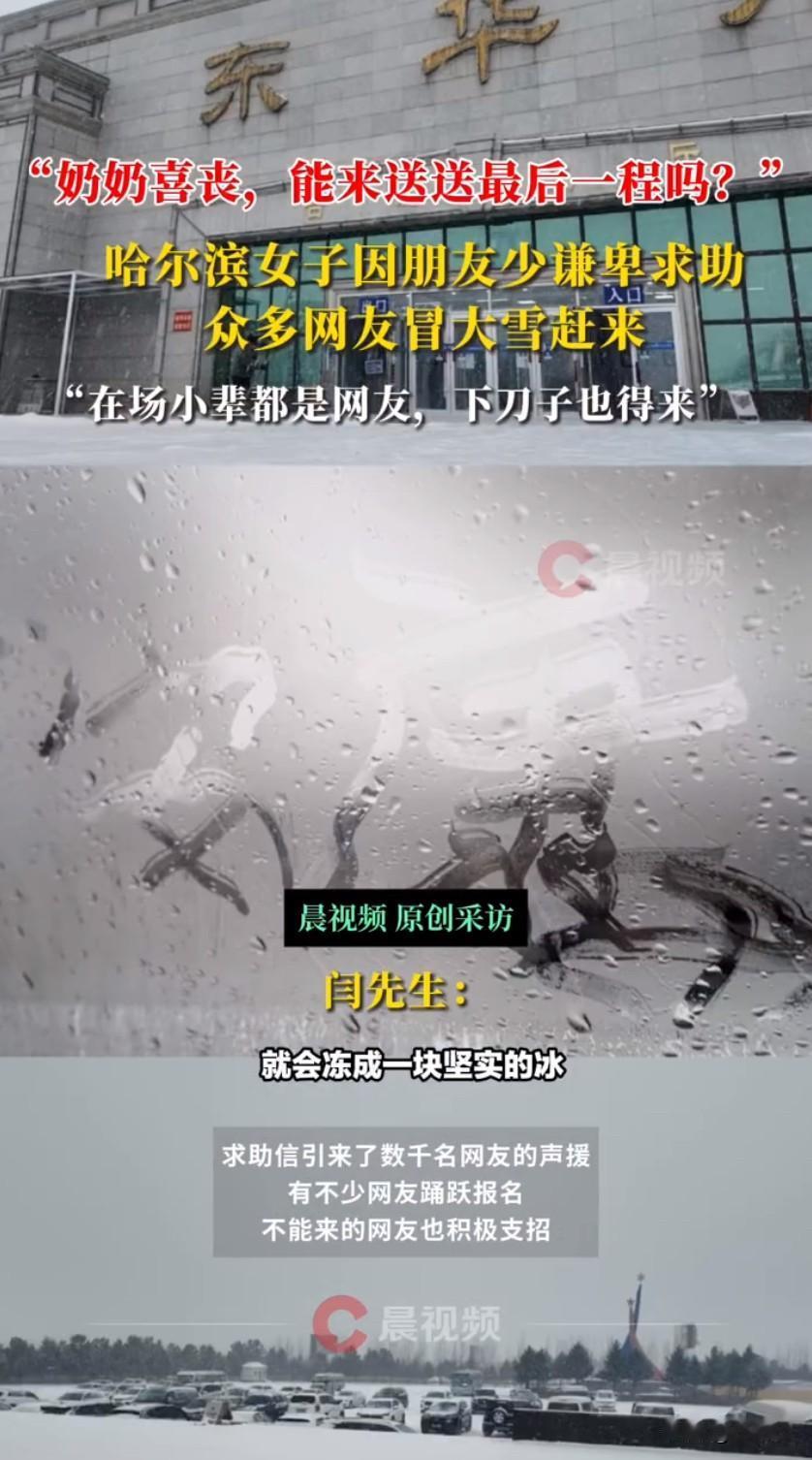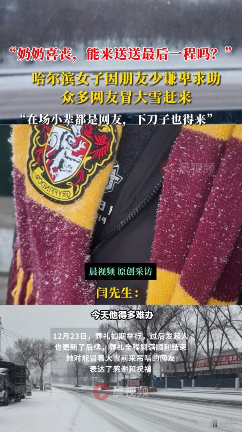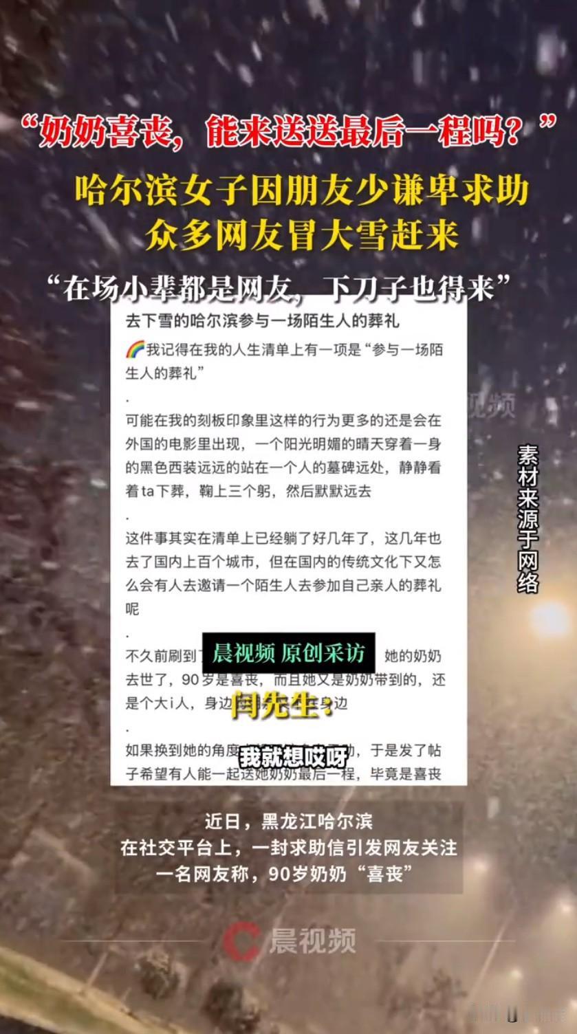 在黑龙江哈尔滨,一位网友在社交平台发了封特别的求助信,内容特别简单:“奶奶喜丧,能来送送最后一程吗?” 原来她的奶奶刚满90岁,按民间说法属于“喜丧”——福寿双全、无疾而终的老人离世,本该热热闹闹送最后一程,可这位网友是个不爱社交的“i人”,朋友圈子特别小,为数不多的朋友还都不在哈尔滨,身边连能帮忙撑场面的晚辈都凑不齐,看着空荡荡的筹备现场,她实在不想让疼她的奶奶走得孤单,思来想去才鼓起勇气在网上求助。 葬礼那天,哈尔滨下起了难得一见的大雪,雪花打在脸上都生疼,交通变得格外不方便,打车打不到,坐公交也得等很久,可就算这样,还是有很多网友如约赶了过来。来自浙江的叶先生和女朋友当时正在黑龙江旅行,看到求助信后就特意把这事排进了行程,提前在殡仪馆附近订了酒店,没想到当天雪下得太大,路上还遇到了大堵车,等他们赶到殡仪馆时,奶奶已经被送去了十公里外的火化场。他们在现场结识了同样赶来帮忙的一名游客和一位女大学生,四个人一商量,立马打车继续赶往火化场,最后一起送了奶奶最后一程,虽然没见到发起人事先,叶先生后来还是收到了她的回复,对方为没能好好接待感到抱歉,还特意买了好几张用餐券补偿,让叶先生忍不住感慨东北人的热情实在让人暖心。 本地的闫先生是深夜刷到的求助信,他琢磨着“但凡有一点办法,也不会大半夜上网找人”,感同身受的他立马私信承诺会到。前一天忙到凌晨三点才回家的他,为了赶早上七点的约定,几乎没怎么休息,五点就被窗外的雪光惊醒,顶着漫天大雪出门,原本18分钟的路程走了40多分钟,终于准时赶到现场。 那天准时抵达的网友有三四十人,还有不少人因为大雪堵在了路上。现场发起人的亲朋好友不多,和她同龄的几乎没有,在场的小辈全是素不相识的网友。大家有序地来到奶奶的晶棺前默哀、鞠躬、绕行,之后还陪着家属一起去火化场,有人还在主持人的邀请下发言,因为是工作日,很多人送完老人就赶回去上班了,只有少数几个人留到中午才离开,葬礼结束后,发起人特意更新了后续,说全程圆满顺利,还一个劲儿地对冒着大雪赶来的网友们表达感谢和祝福,这场跨越陌生的送别,让寒冷的冬日里满是人间真情。 来源:晨视频