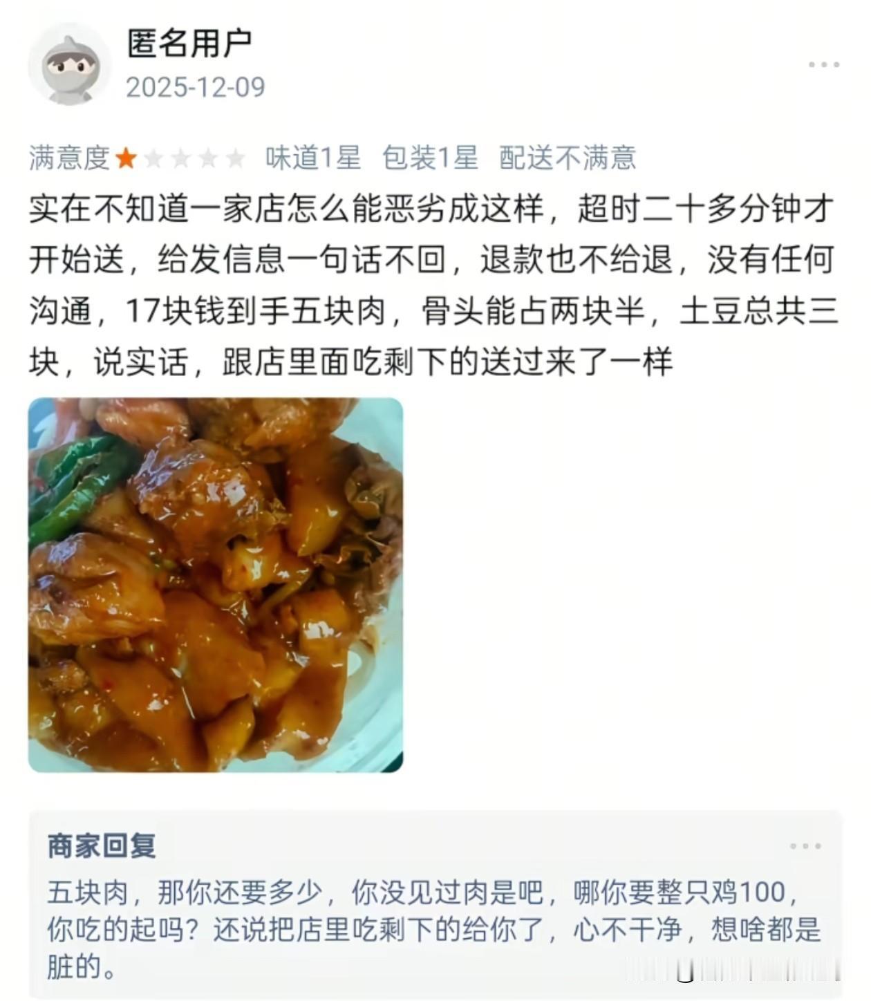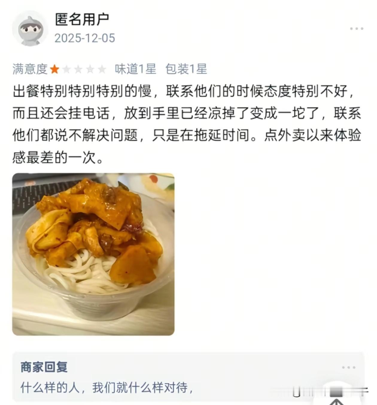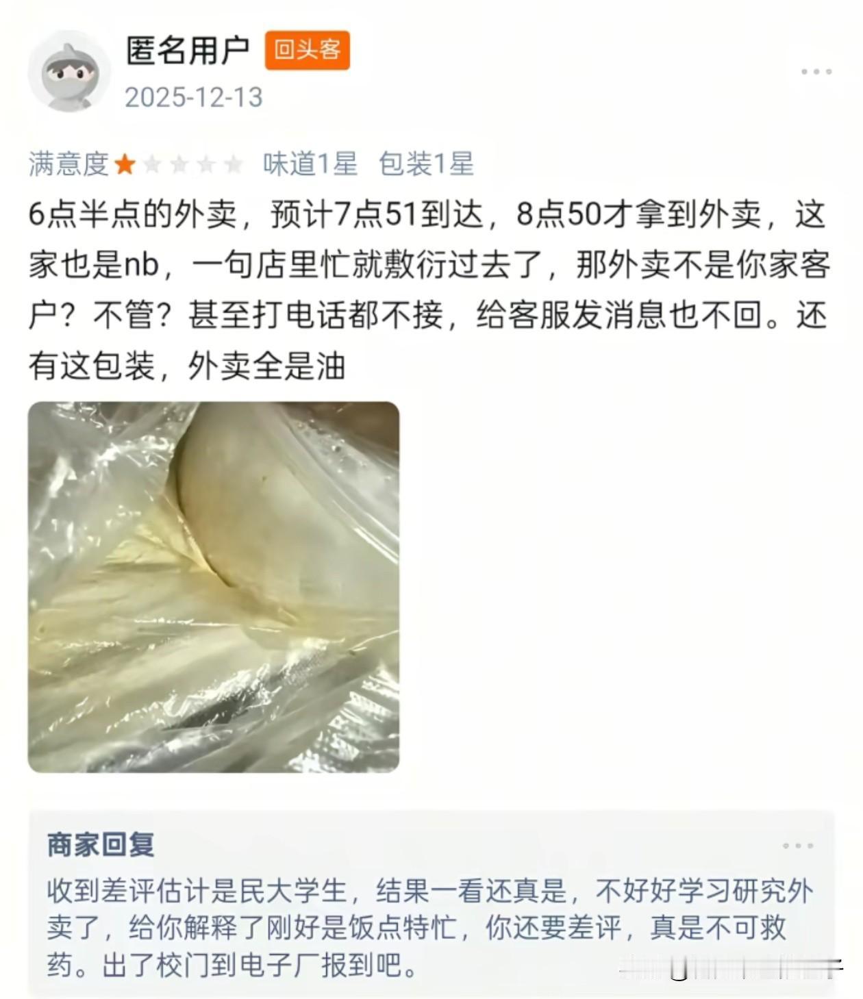 甘肃,西北民族大学一学生点了学校门口的大盘鸡,因外卖超时了20分钟,送来的份量又少,便打了差评,没想到老板却在评论区回复嘲讽该学生学历低,以后毕业了只能去送外卖。 没想到,老板这个回复却引起了众怒,作为衣食父母居然被这样辱骂,于是大量学生联合对该店发起了抵制,并找到品牌方解除和该店铺的合作,还找来了消防和市监对店铺进行检查。 不过这个老板也是个犟种,就算宁愿关店也不愿承认他有错,最开始品牌方本想让他和学生道个歉,这事儿就算了,可以继续用这个招牌,没想老板又开始骂品牌方负责人。 一句话毁了自己的生意,不止嘲讽了大学生,还有外卖员和电子厂,这情商简直低到了极点。 不过这老板也是个性情中人,算是个狠人,店不开了也不愿低头,牛!