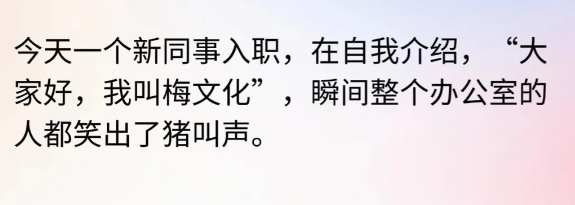 今天一个新同事入职,在自我介绍,"大家好,我叫梅文化",瞬间整个办公室的人都笑出了猪叫声。