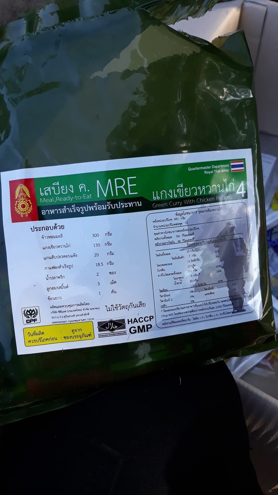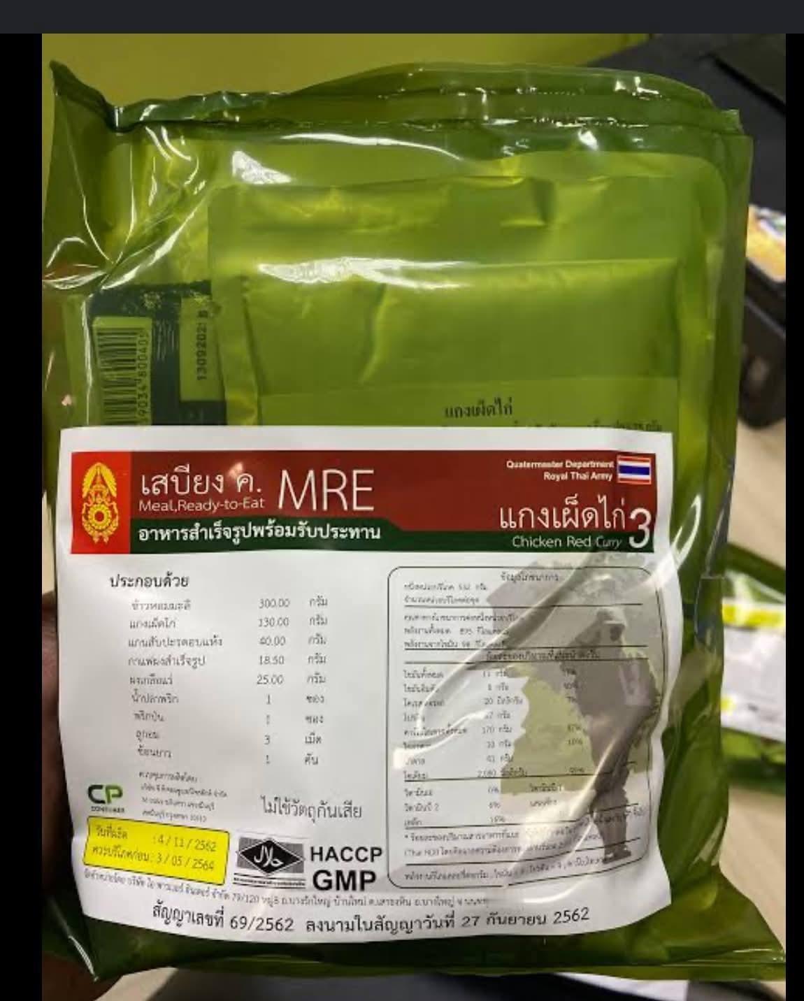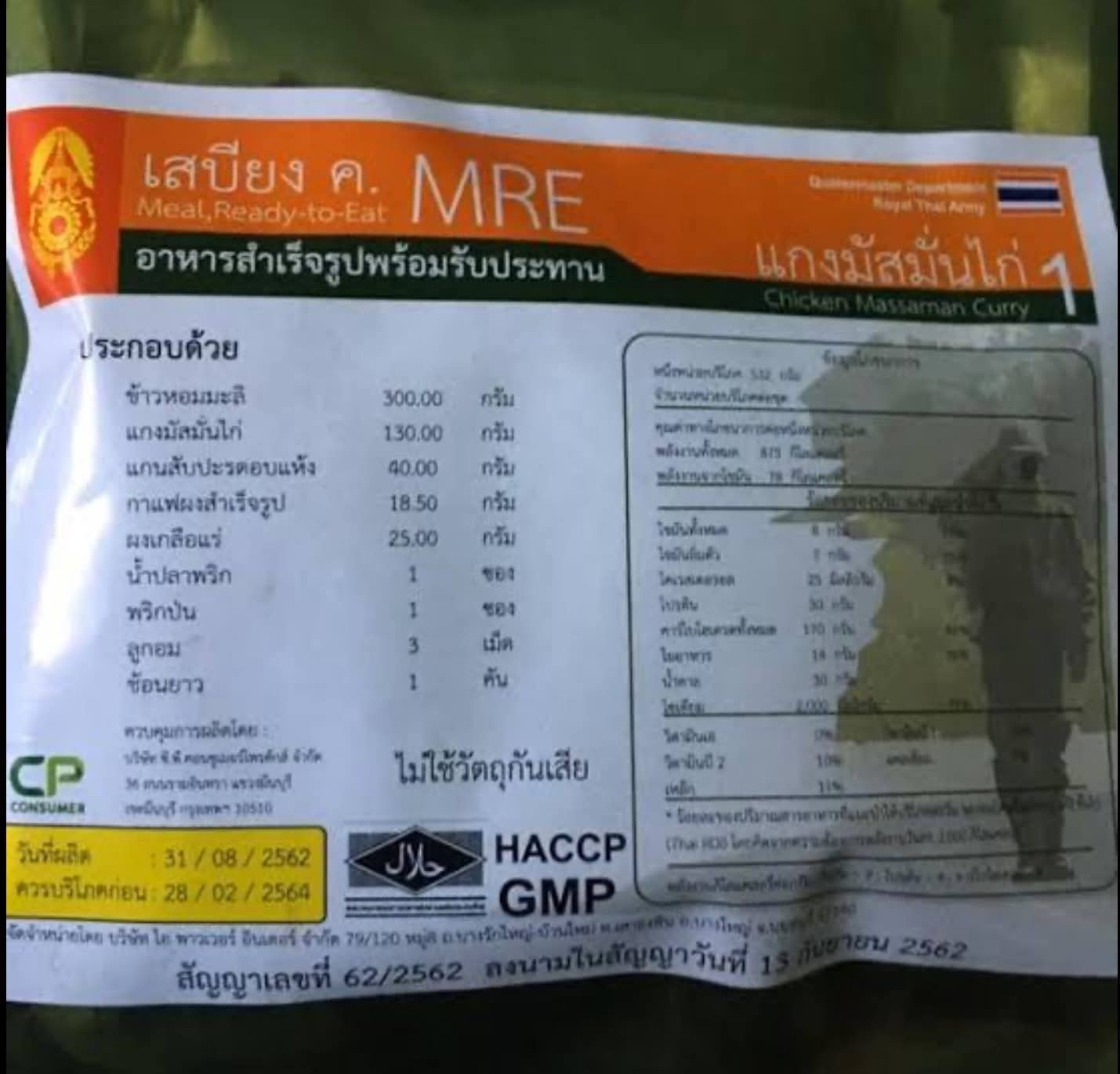 本次泰柬冲突中,部分吃不上热餐的泰军单位的伙食就靠这种非常有本国特色的MRE外加单独另发的泰式小炒牛肉罐头,MRE一共有7种不同的主食包,主食全部是糯米饭团,大概看了下1,3,4号餐是不同的咖喱浇头,其他几种为九层塔炒鸡,椰香鸡,姜炒鸡,香辣鱼丸等,其他的统一内容物是菠萝果干,咖啡粉,饮料粉,辣椒鱼露调味包还有糖果。反观对面柬军开战一两天后吃不上热餐的单位就基本只能啃900压缩饼干了,打个鸡毛啊。泰柬冲突泰柬冲突13条战线武器装备军迷天地东南亚军情