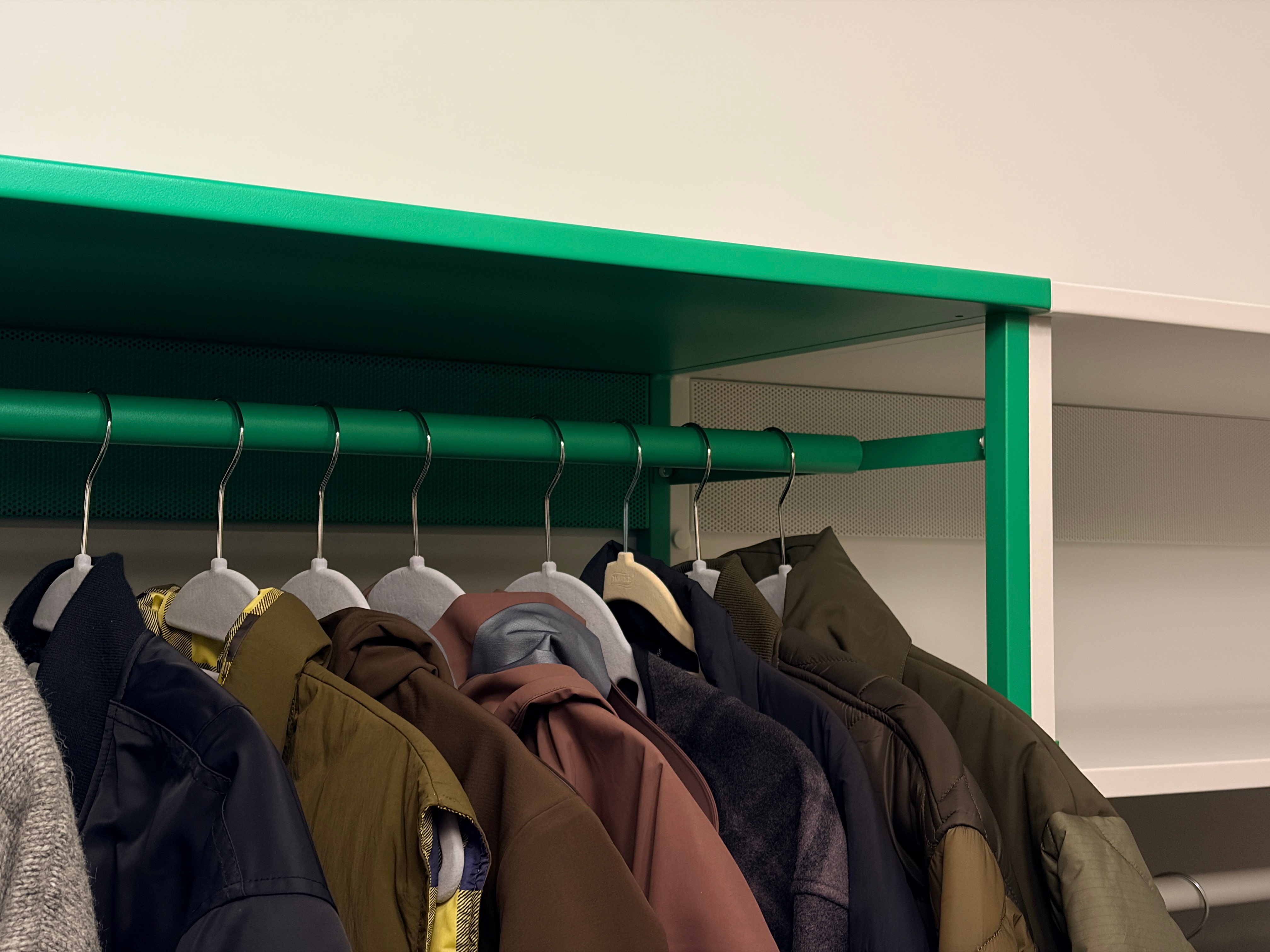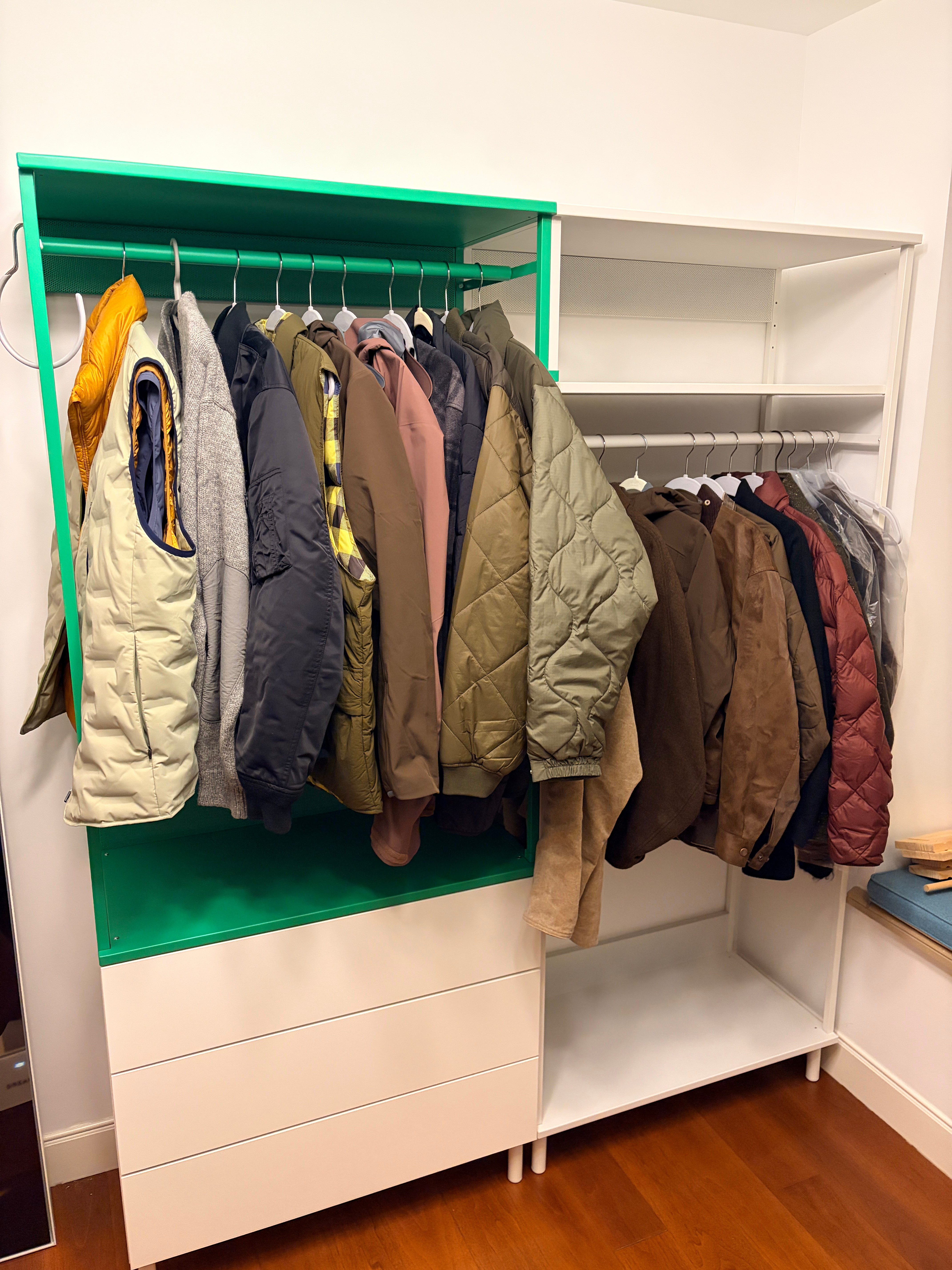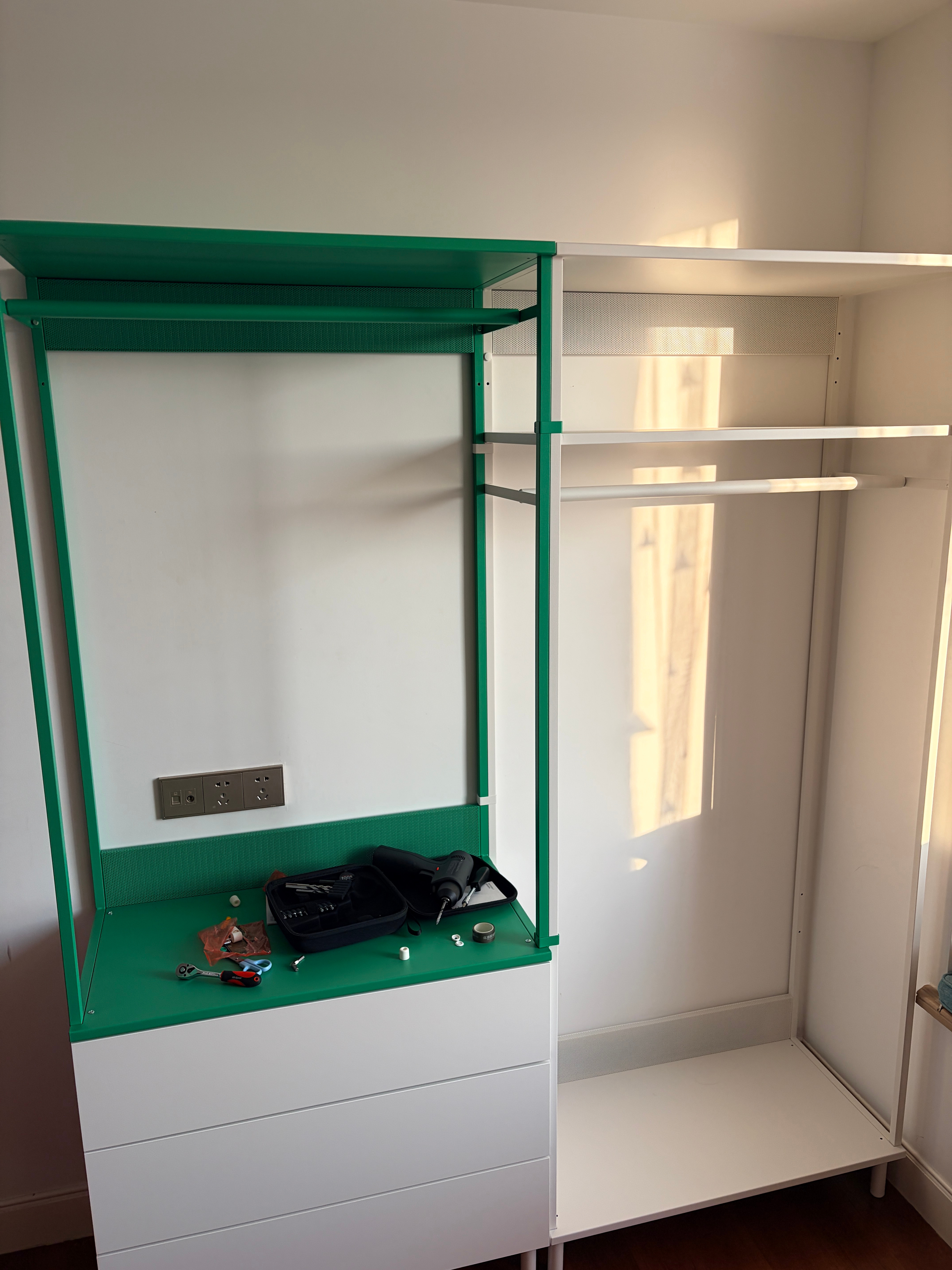 开放衣柜装好了,还是很顺利的,最终成品是这个样子,还有三个绿色柜门把手在路上。先说购买,来到宜家的衣柜区域,找工作人员用电脑帮你搭配一下。工作人员能立刻调出同尺寸可以用来搭配组合的款式,一两分钟就弄好,组好以后会打出来一张提货单,结完账走到提货区,基本上你的东西就搭配好了,直接拖走就行。这个衣柜一共三部分,分别是普拉萨绿色衣架,普拉萨白色落地衣架,普拉萨三层抽屉柜。你可以随意组合,小红书上也有不少参考案例。整个普拉萨宇宙非常庞大,你可以组合出不同风格的衣架衣柜。安装过程比较简单,大概3小时完成,安装后墙上拉两个膨胀螺丝,基本上就不会晃动了,还是很稳固的,颜色很正,做工也比同价位的淘宝货要好一些,总价1530,还是值得的。目前的宽度是160cm,高度是191cm(180的架子和11cm的腿),后续可能会在顶部增加一些箱子之类的,看起来会更扎实一些,目前略空旷。