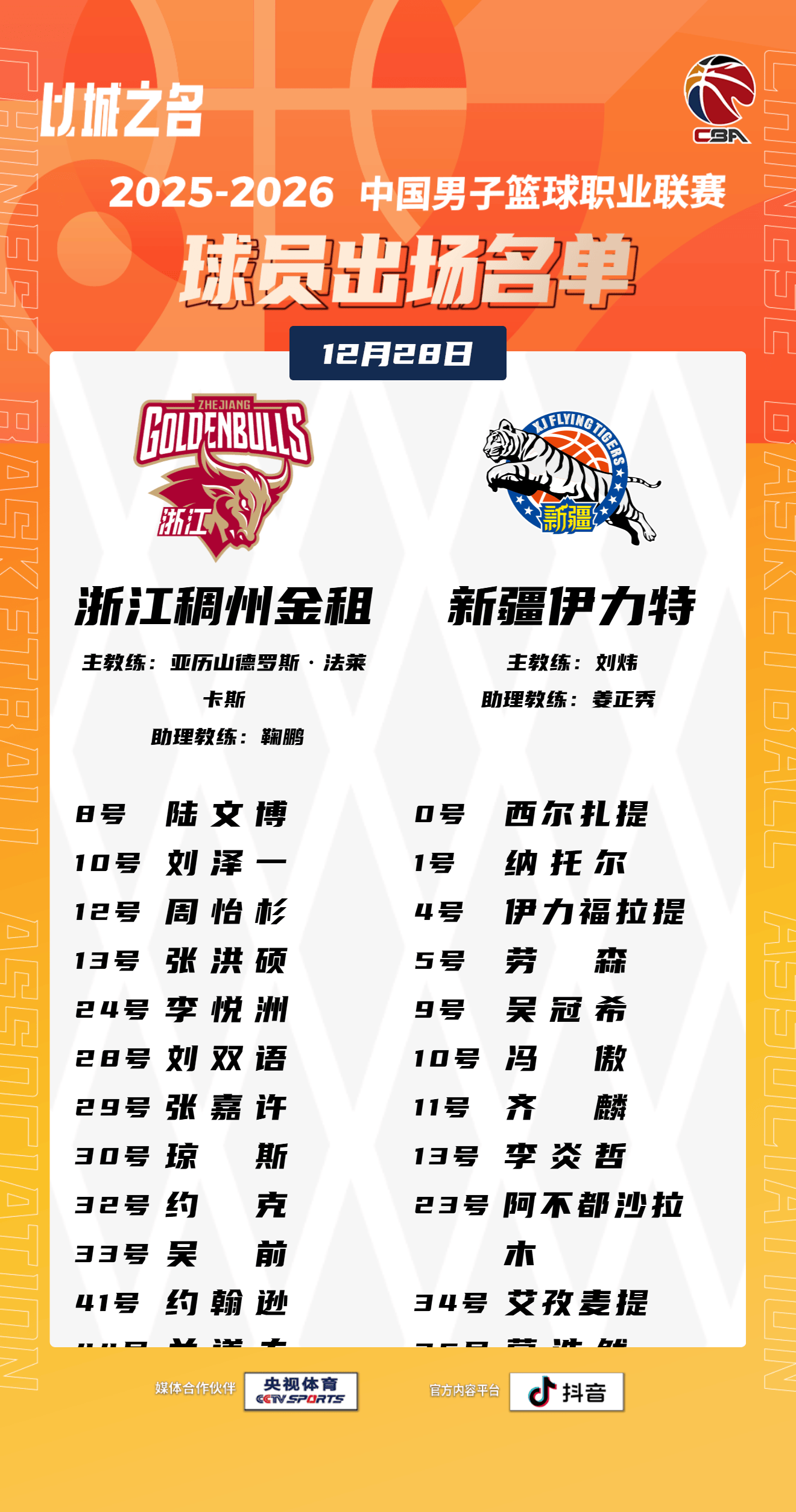 虎扑12月28日讯今日CBA常规赛,浙江对阵新疆的大名单已经公布。