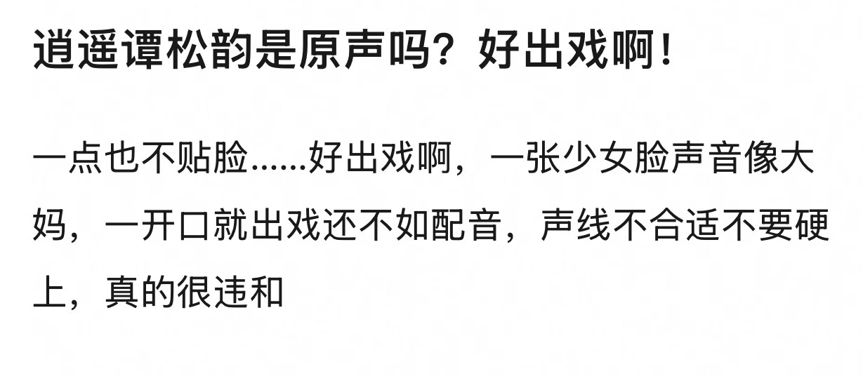 谭松韵台词谭松韵的台词太现代了,郫县都在吐槽,古装剧她必须配音,和脸也不搭,音色也不好听,有人说像贾玲在演仙侠剧,逍遥这个剧其实不该找她,换个甜妹都可以的,很可惜,而且谭松韵的扛剧能力也不行了,很多人被谭松韵的台词劝退,不然这个剧会更好吧,你们看了觉得呢?