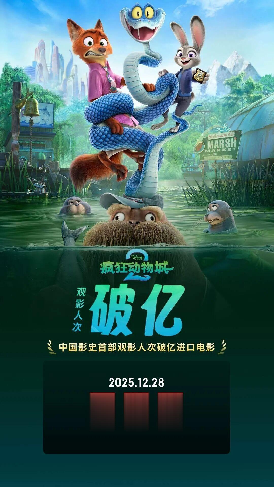 12月28日,据猫眼专业版数据,电影《疯狂动物城2》上映33天,观影人次破亿,成为中国影史首部观影人次破亿进口电影。
