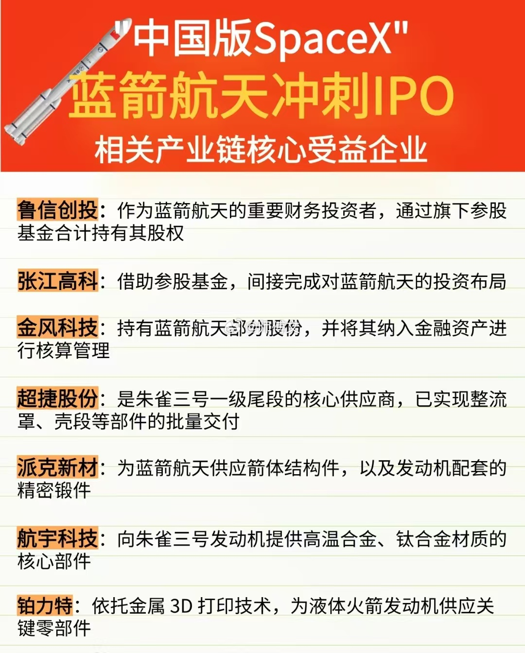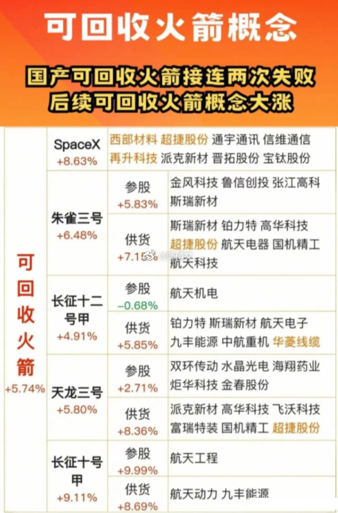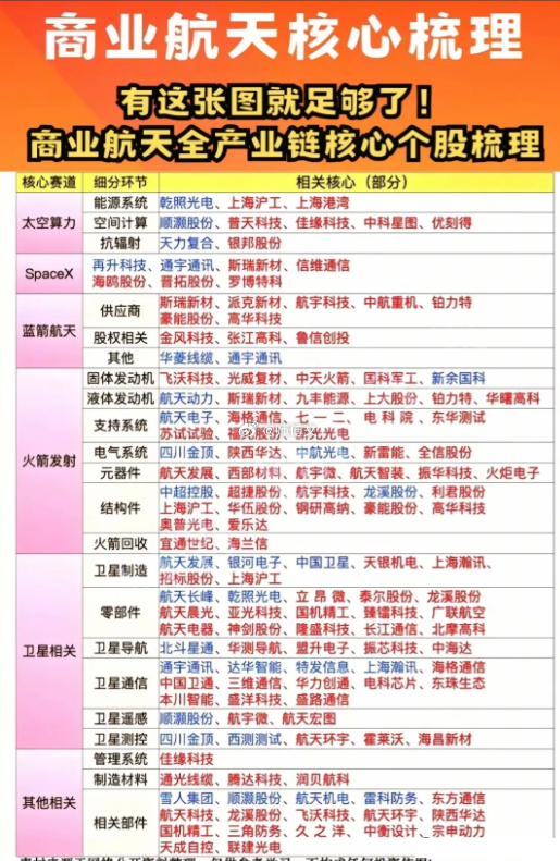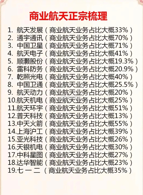 商业航天再迎政策东风!19家概念核心龙头业务占比率曝光上交所发布商业火箭企业科创板第五套上市标准细化规则,明为商业火箭企业登陆资本市场划定清晰路径,行业发展按下加速键🚀!“中国版SpaceX”蓝箭航天冲刺IPO,商业航天产业链迎来新机遇!斯瑞新材、应流股份、鲁信创投等一众企业分别在零部件供应、投资布局等维度深度绑定蓝箭航天,成为产业链核心受益方,商业航天的资本版图与产业生态正加速成型🚀国产可回收火箭虽接连两次试验失利,却未阻挡资本市场对该赛道的热情,可回收火箭概念板块逆势大涨。SpaceX、朱雀三号、天龙三号等相关产业链标的表现亮眼,超捷股份、派克新材、铂力特等供货企业,以及鲁信创投、张江高科等参股企业均跻身受益阵营,商业航天的资本热度持续攀升🚀19家企业的商业航天概念龙头业务占比出炉:$中国卫星 sh600118$ 、$通宇通讯 sz002792$ 业务占比超70%位居前列,$航天环宇 sh688523$ 、中天火箭等企业也在该领域布局颇深,为挖掘商业航天核心标的提供了明确参考。理财有风险入市需谨慎!