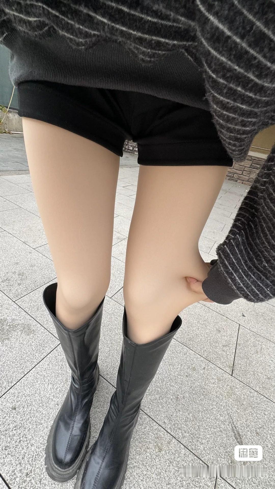 穿着皮靴和短裙,休闲又时尚。