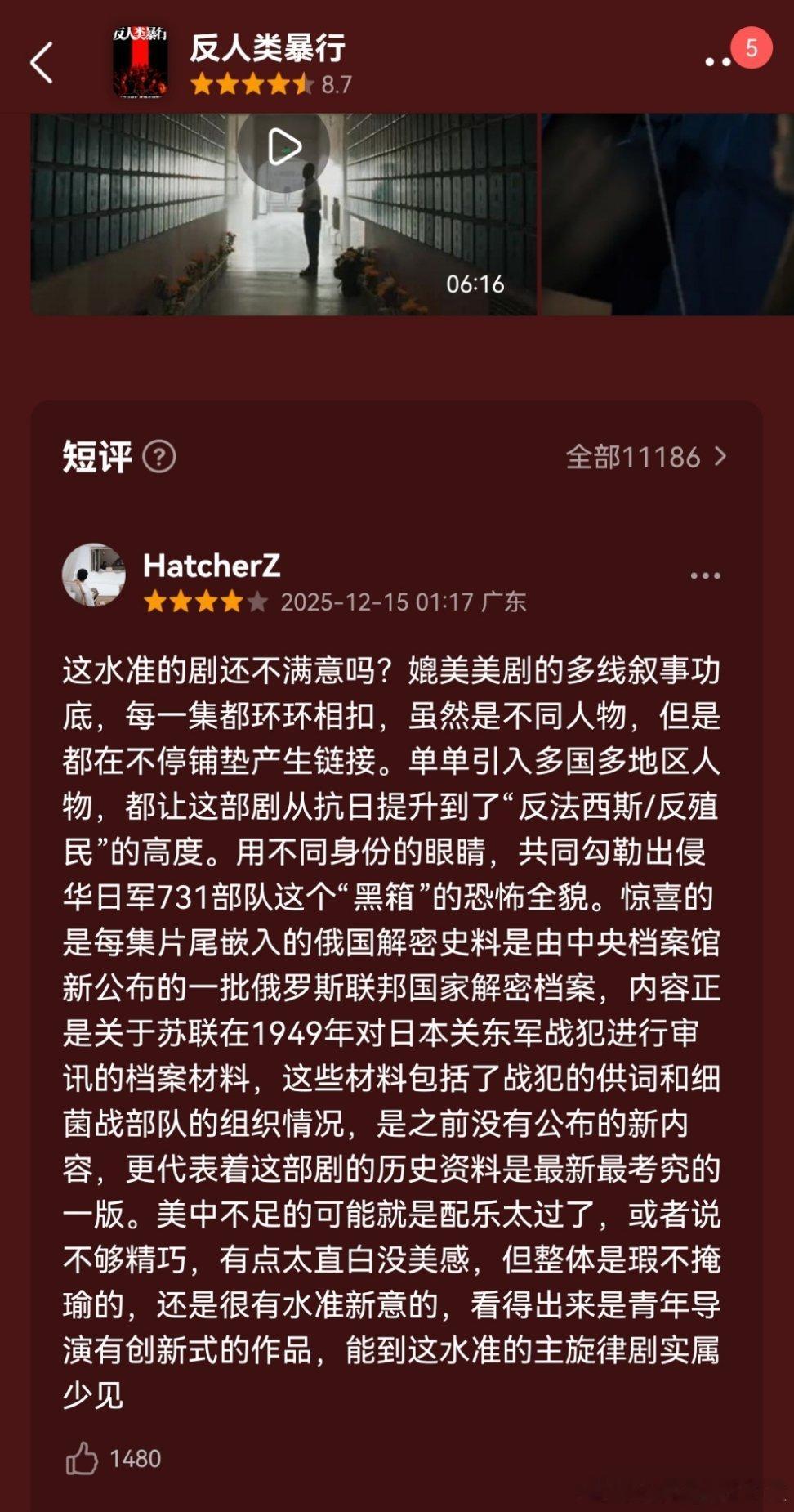 反人类暴行就是曲高和寡,褒义上的曲高和寡。在国产剧有罪主旋律罪上加罪的郫县能拿8.7你们就知道是个什么概念了。目前为止各方面都没毛病,除了担心尹正演完会有心理阴影。