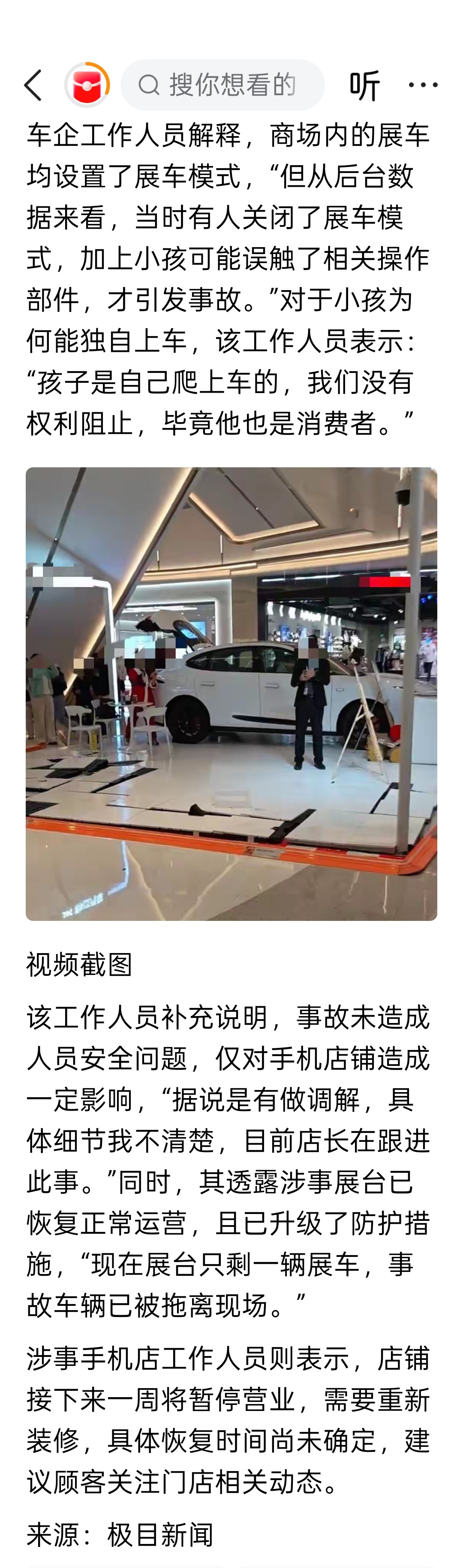广东中山一商场展车撞入手机店,车企工作人员:小孩误触所致,无人受伤