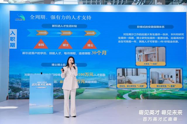 本次招聘会特设城市宣传推介舞台,南沙区人社局副局长禹继以“选择南沙,‘才’见高光”为主题,介绍区域人才政策优势,详细解读“跨省面试补贴”“免费住宿服务”“人才生活补贴”等重磅政策:应届毕业生来南沙面试享受最高800元交通补贴;对来南沙游玩、面试、入职的大学生,分别提供3晚、7晚和15晚免费的过渡性住宿;对新引进的本科生、硕士研究生、博士研究生分别给予每月1000元、2000元、4000元生活补贴,连续发放30个月……同时,还介绍了子女入学、医疗便利等配套服务,用翔实数据和生动案例凸显南沙“近悦远来”的引才诚意,吸引现场求职者纷纷驻足聆听、踊跃咨询。