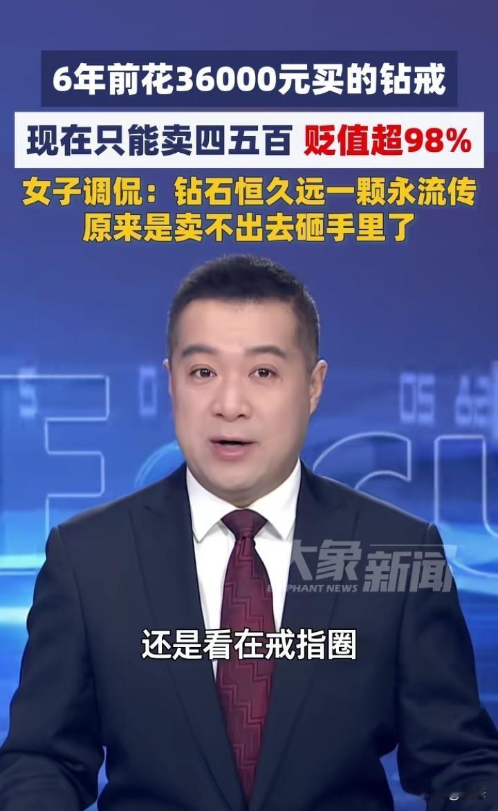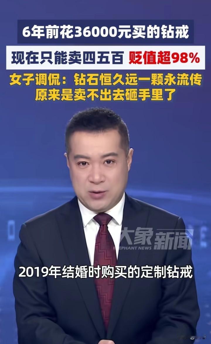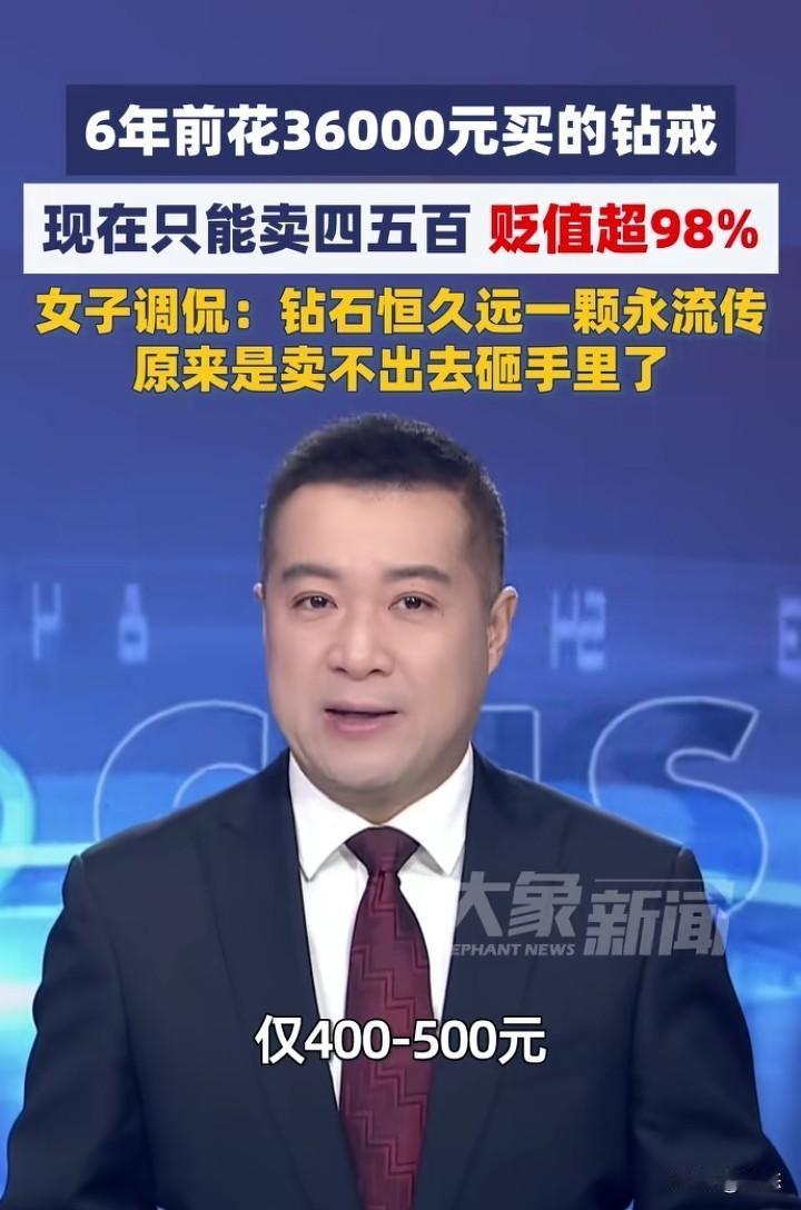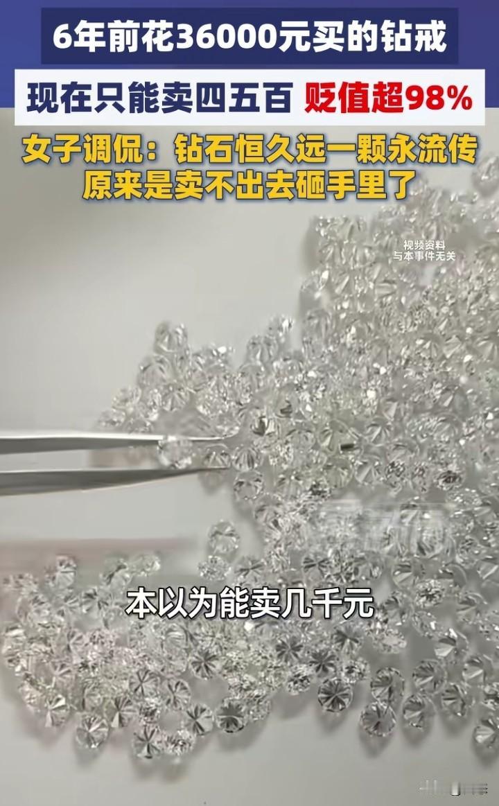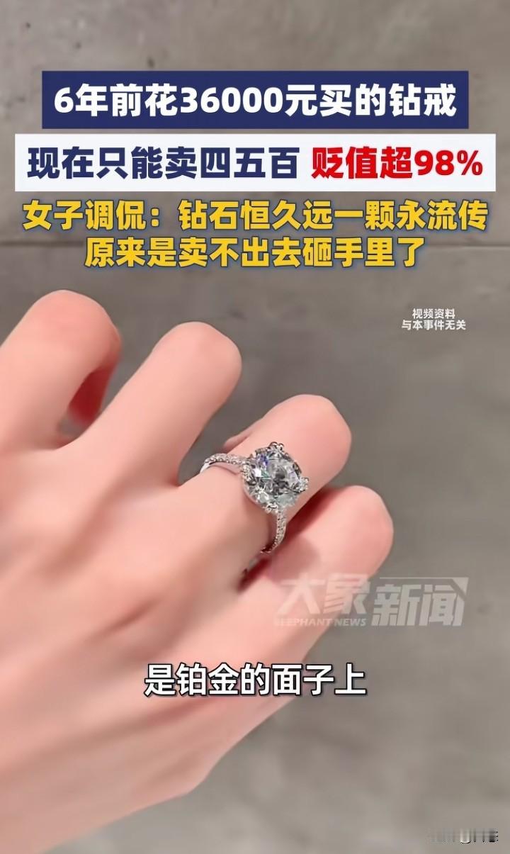 不敢相信,六年前的钻戒💍花了36000元买的,没想到现在只能卖几百元。一女子吐槽到,六年前定制的结婚钻戒, 本以为会卖几千元,没想到才几百元,贬值超过了98%。女子永恒的钻戒,居然是因为卖不出去。 没有关注钻戒,3万多买点怎么才回收几百元,有点夸张了。 你们怎么看,为什么黄金却能保值?