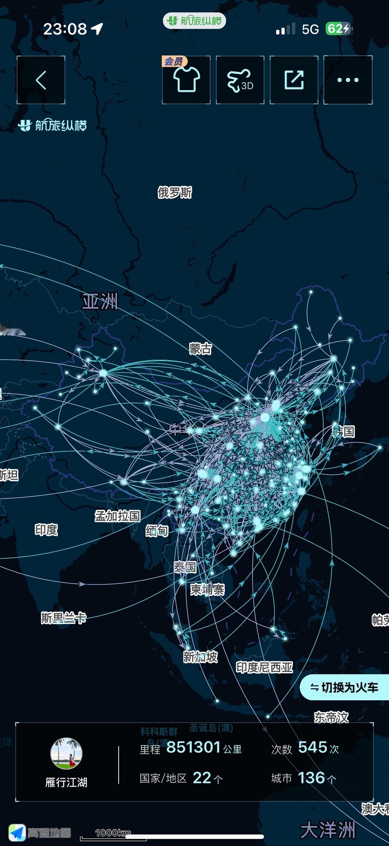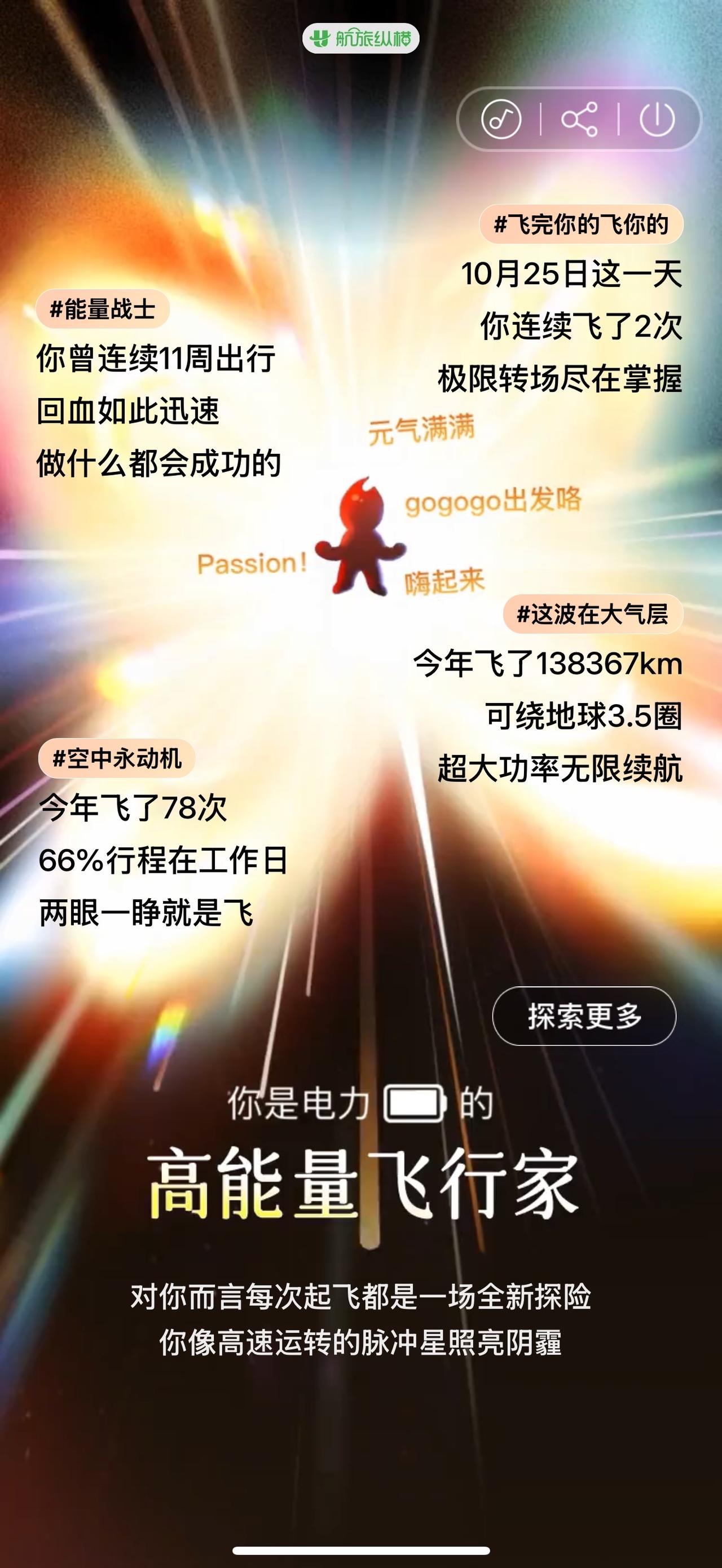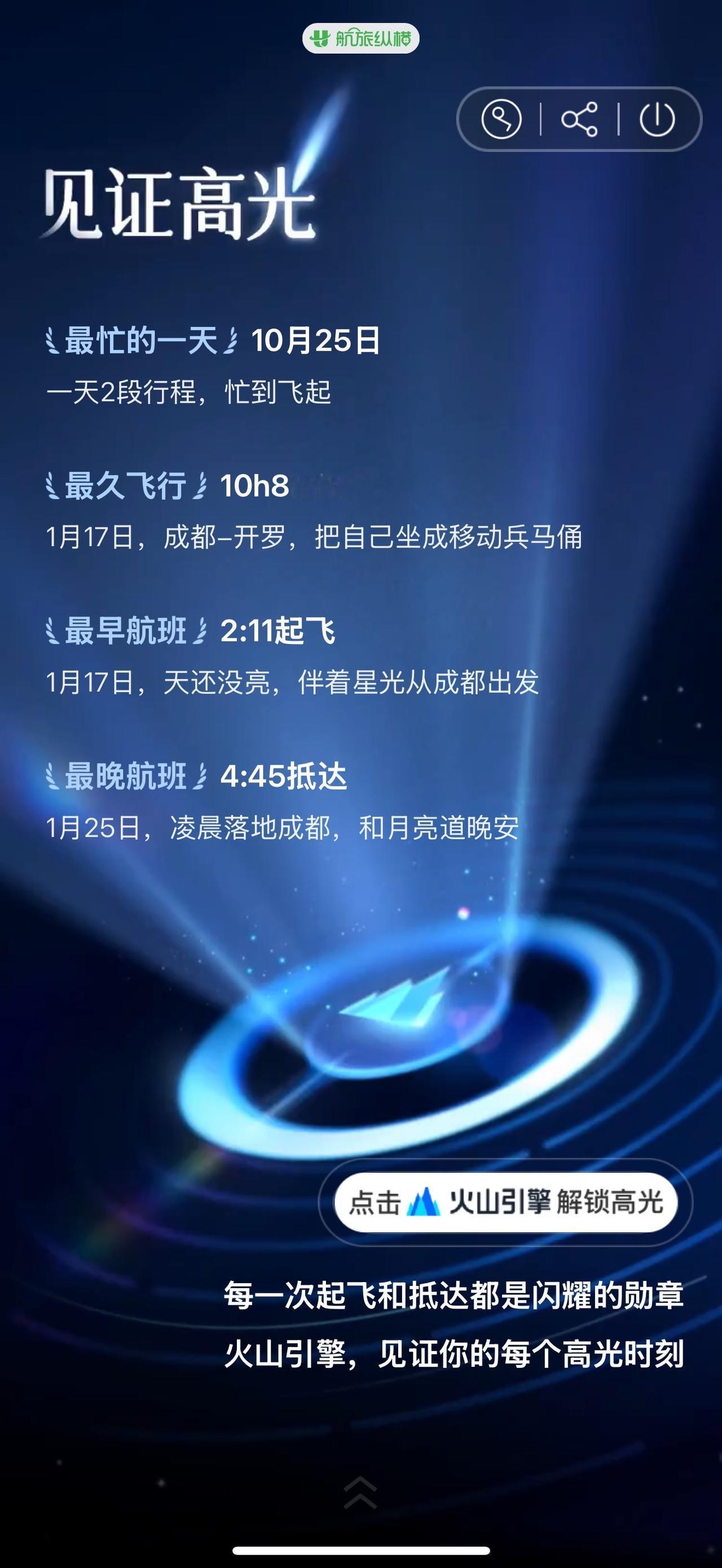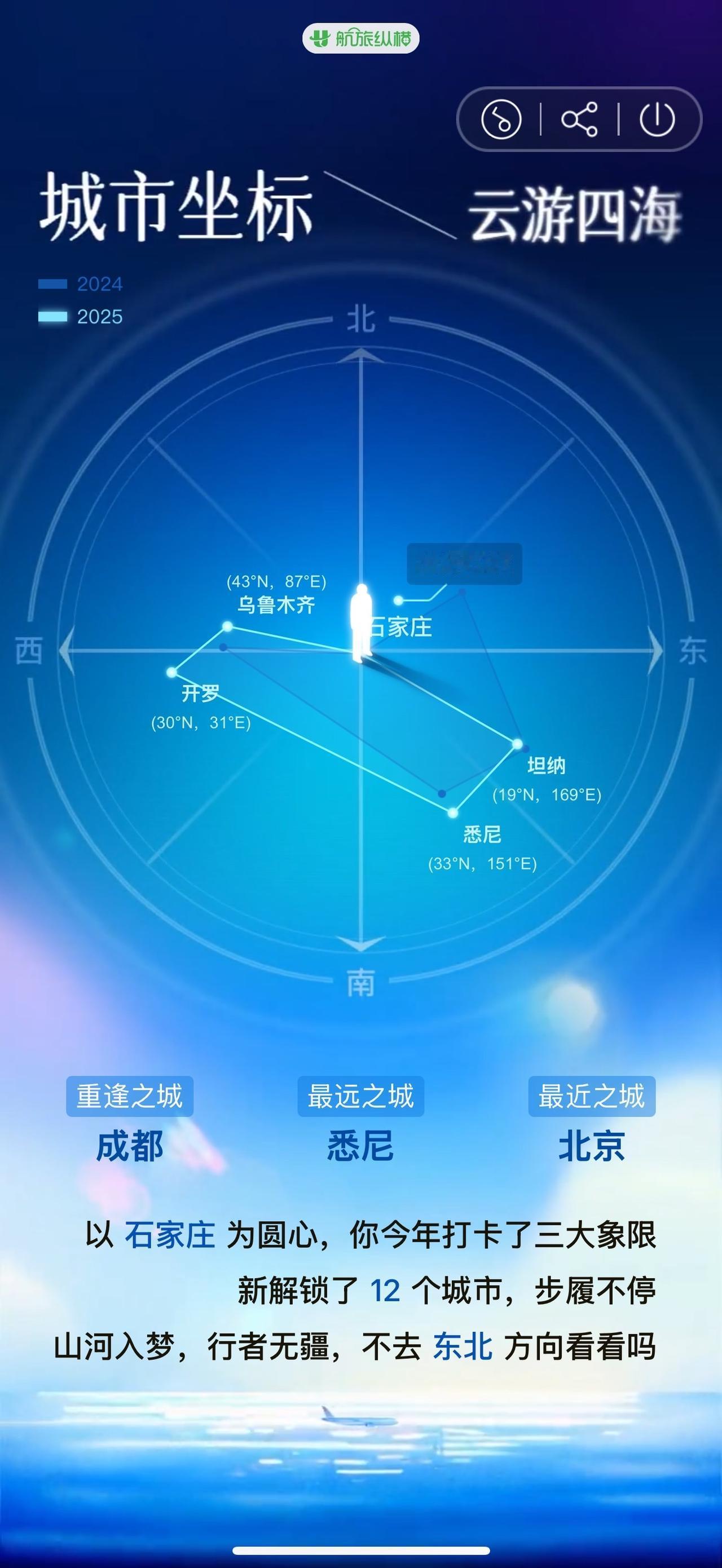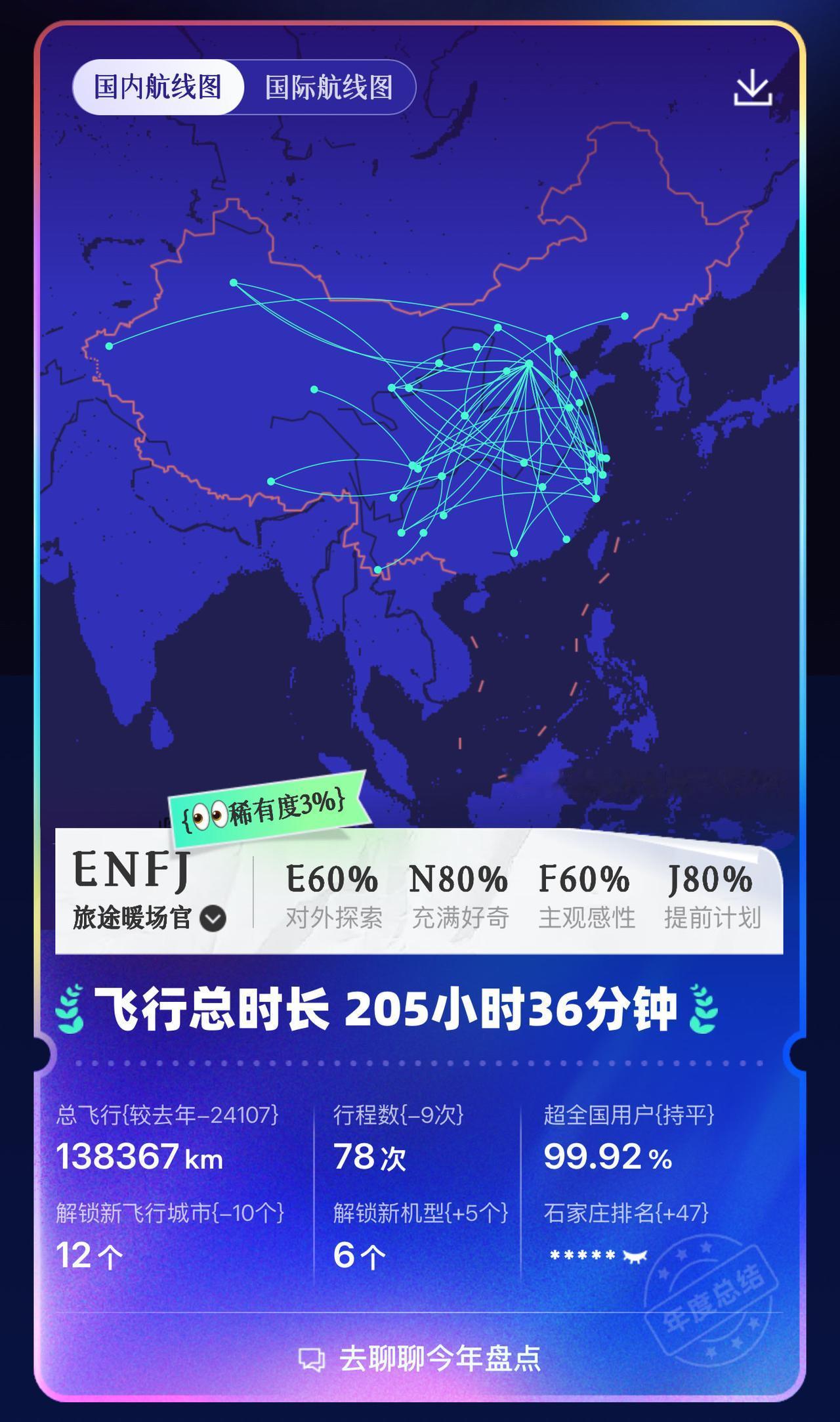 我的2025| 🩵 山河入梦 行者无疆 今年飞行78次,13.83km, 今年火车65次,1.9万km, 行走8个国家,47座机场 最久飞行:成都-开罗,10个多小时, 把自己坐成移动兵马俑。 今年比去年少了7次飞行。 希望明年可以解锁更多的国家[心] 航旅纵横:电力满格的高能量飞行家