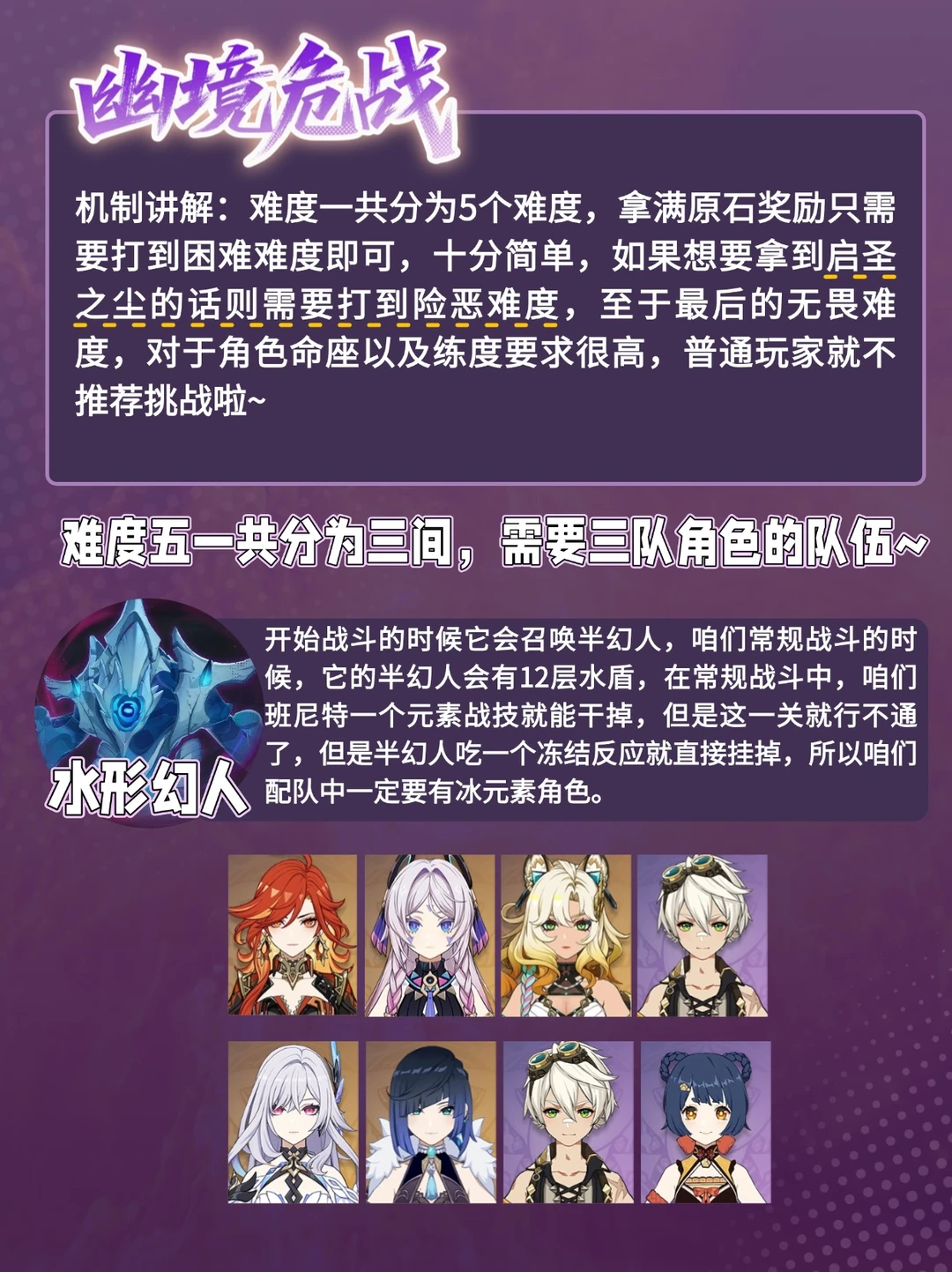 【幽境危战难度5️⃣配队攻略[哇R]】 1️⃣完成困难难度即可获得全部的450原石 2️⃣每花120体力,可得一个金圣遗物 3️⃣拿到启圣之尘(重塑圣遗物副词条强化结果)需要打到险恶难度 4️⃣打完危战6绝境可得武器幻化限时道具