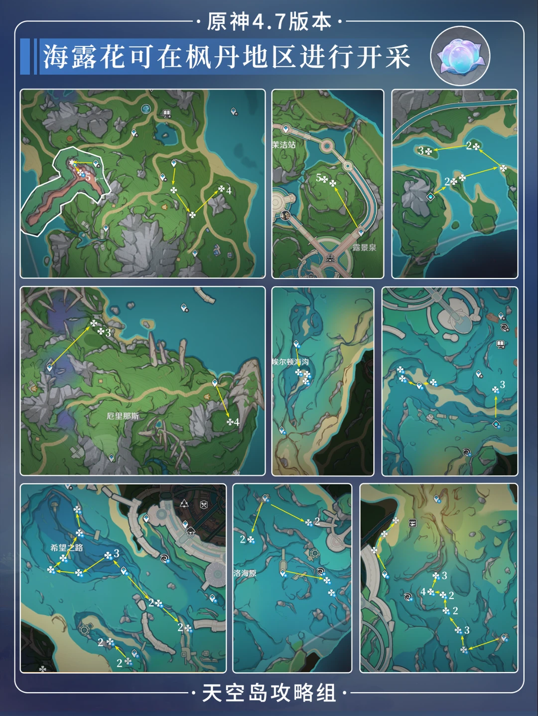 祝大家都能抽到希格雯!十连满命[哇R] 希格雯采集材料都在这里! 包括海露花和原海异种路线图[飞吻R] 推荐队伍中带林尼,可在小地图里进行标注 ——————————————— 提升角色等级和天赋: 需要打枫丹周本boss吞星之鲸 枫丹boss水形幻人 刷枫丹周一/四秘境“公平”