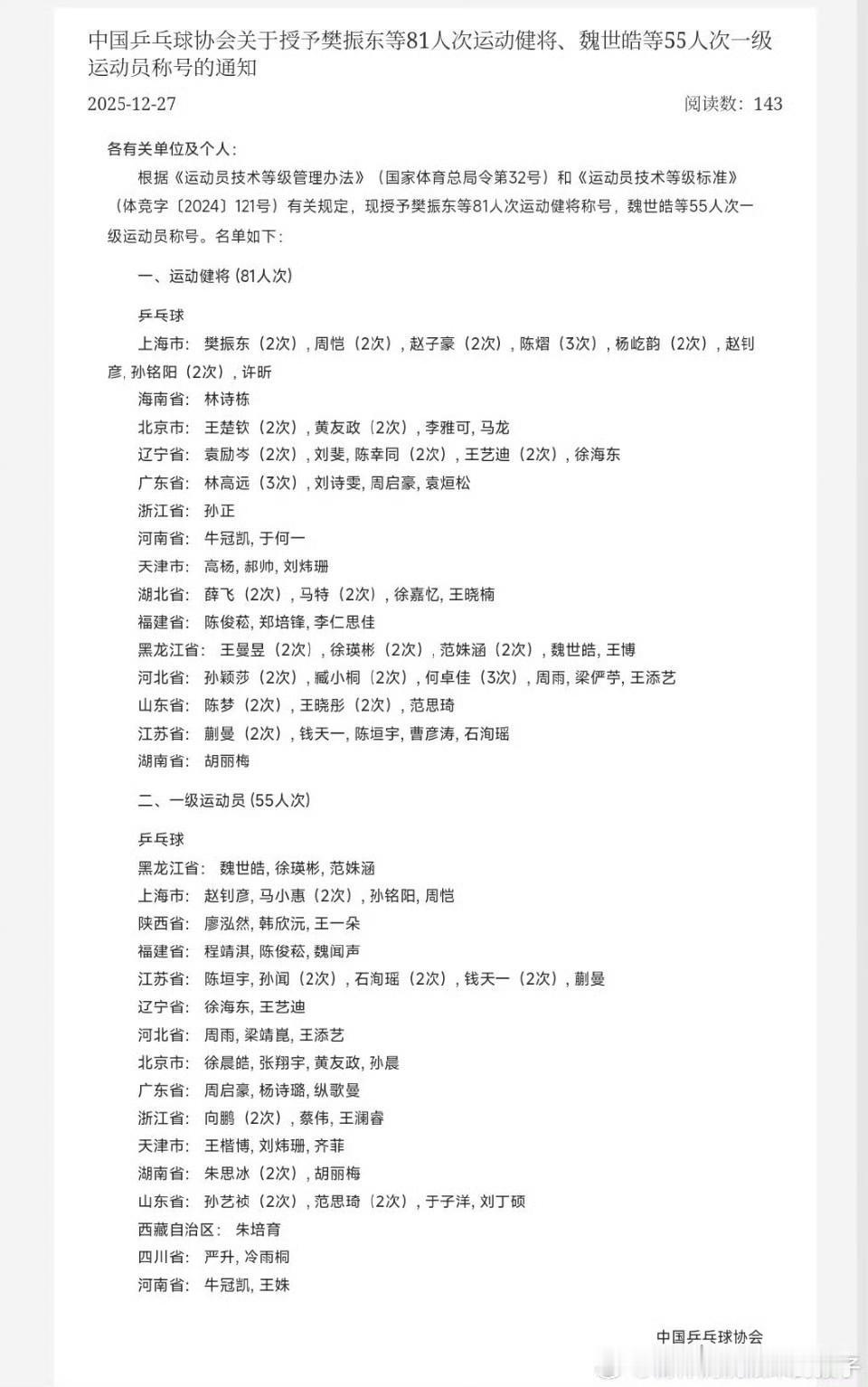 中国乒乓球协会关于授予樊振东等81人次运动健将、魏世皓等55人次一级运动员称号的通知👀 根据《运动员技术等级管理办法》(国家体育总局令第32号)和《运动员技术等级标准》(体竞字〔2024〕121号)有关规定,现授予樊振东等81人次运动健将称号,魏世皓等55人次一级运动员称号。名单如下: 一、运动健将 (81人次) 上海市: 樊振东(2次), 周恺(2次), 赵子豪(2次), 陈熠(3次), 杨屹韵(2次), 赵钊彦, 孙铭阳(2次), 许昕 海南省: 林诗栋 北京市: 王楚钦(2次), 黄友政(2次), 李雅可, 马龙 辽宁省: 袁励岑(2次), 刘斐, 陈幸同(2次), 王艺迪(2次), 徐海东 广东省: 林高远(3次), 刘诗雯, 周启豪, 袁烜松 浙江省: 孙正 河南省: 牛冠凯, 于何一 天津市: 高杨, 郝帅, 刘炜珊 湖北省: 薛飞(2次), 马特(2次), 徐嘉忆, 王晓楠 福建省: 陈俊菘, 郑培锋, 李仁思佳 黑龙江省: 王曼昱(2次), 徐瑛彬(2次), 范姝涵(2次), 魏世皓, 王博 河北省: 孙颖莎(2次), 臧小桐(2次), 何卓佳(3次), 周雨, 梁俨苧, 王添艺 山东省: 陈梦(2次), 王晓彤(2次), 范思琦 江苏省: 蒯曼(2次), 钱天一, 陈垣宇, 曹彦涛, 石洵瑶 湖南省: 胡丽梅 二、一级运动员 (55人次) 黑龙江省: 魏世皓, 徐瑛彬, 范姝涵 上海市: 赵钊彦, 马小惠(2次), 孙铭阳, 周恺 陕西省: 廖泓然, 韩欣沅, 王一朵 福建省: 程靖淇, 陈俊菘, 魏闻声 江苏省: 陈垣宇, 孙闻(2次), 石洵瑶(2次), 钱天一(2次), 蒯曼 辽宁省: 徐海东, 王艺迪 河北省: 周雨, 梁靖崑, 王添艺 北京市: 徐晨皓, 张翔宇, 黄友政, 孙晨 广东省: 周启豪, 杨诗璐, 纵歌曼 浙江省: 向鹏(2次), 蔡伟, 王澜睿 天津市: 王楷博, 刘炜珊, 齐菲 湖南省: 朱思冰(2次), 胡丽梅 山东省: 孙艺祯(2次), 范思琦(2次), 于子洋, 刘丁硕 西藏自治区: 朱培育 四川省: 严升, 冷雨桐 河南省: 牛冠凯, 王姝 樊振东王楚钦孙颖莎被授予运动健将 2025.12.28
