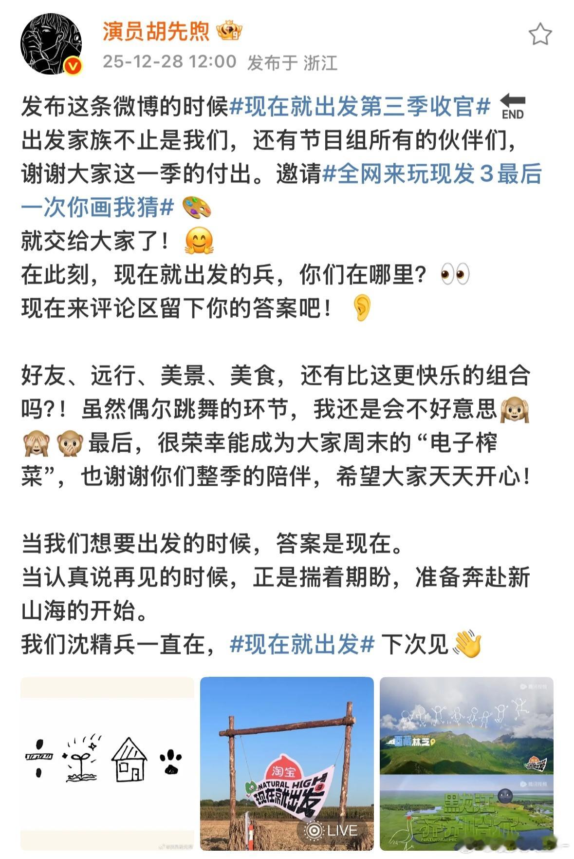 胡先煦说沈精兵一直在现在就出发被胡先煦的收官感言狠狠治愈,真诚的文字搭配用心的手绘,沈精兵一直在,期待和出发家族的再次重逢。