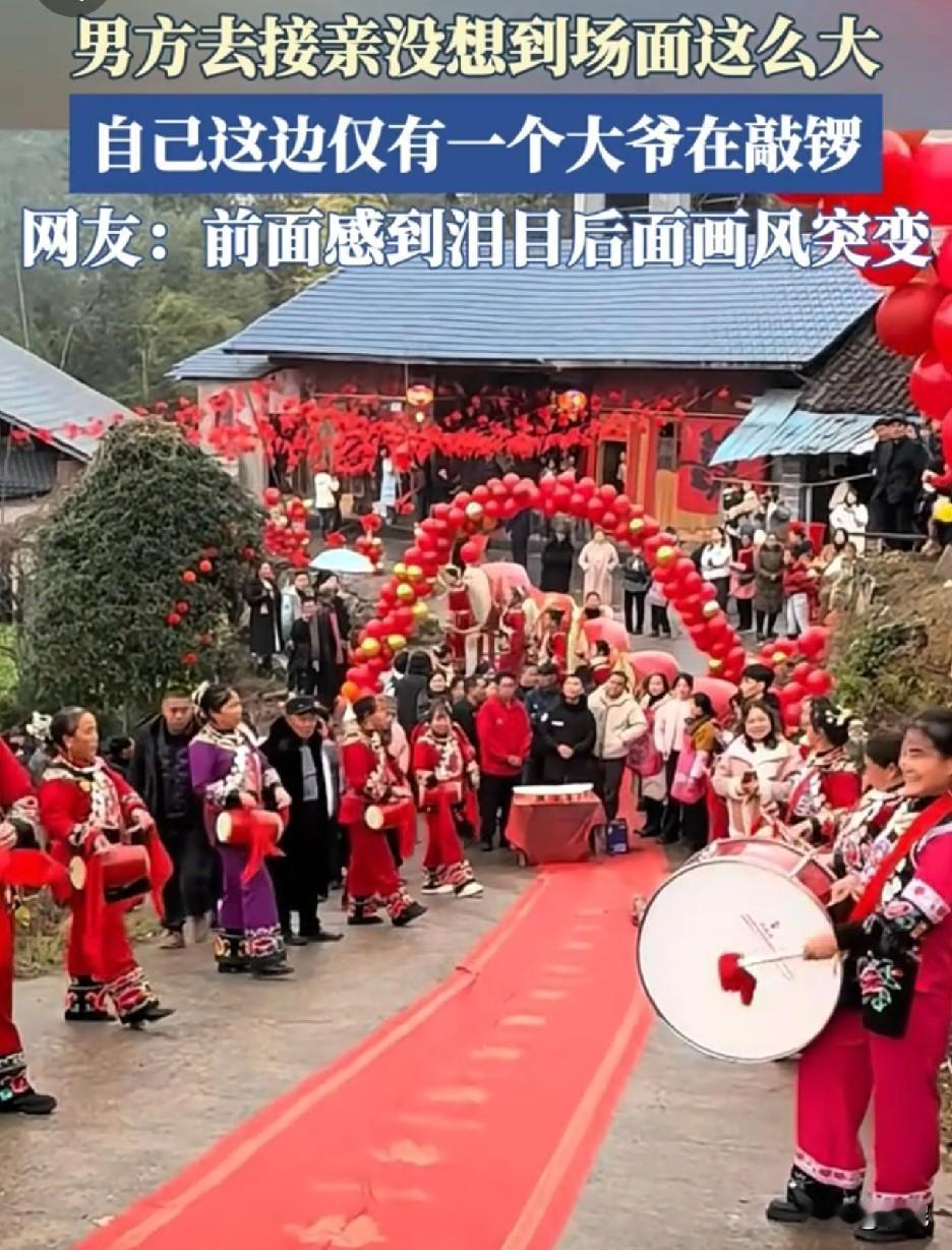 结婚当天,新郎来接亲。新娘家锣鼓喧天,排场十足。而新郎这边寥寥无几,仅只有一大爷在敲锣回应,看得新郎站那,不敢上前,眼神里全是被新娘家震慑到的无力。 这很明显就是少数民族和汉族的结合,但嫁姑娘的很重视自己的女儿,娶媳妇的很寒酸压不住阵,一时分不清谁娶了谁。 这事明显事前没有沟通好,这无论亲成不成,都会成为新郎心中的一根刺吧。当然新郎这边也没有重视这段婚姻,谁家接亲就这几个人,这寒碜的。