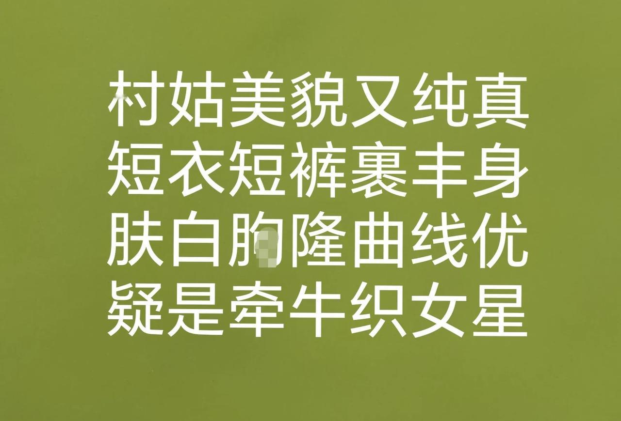 村姑美貌又纯真 短衣短裤裹丰身 肤白胸隆曲线优 疑是牵牛织女星