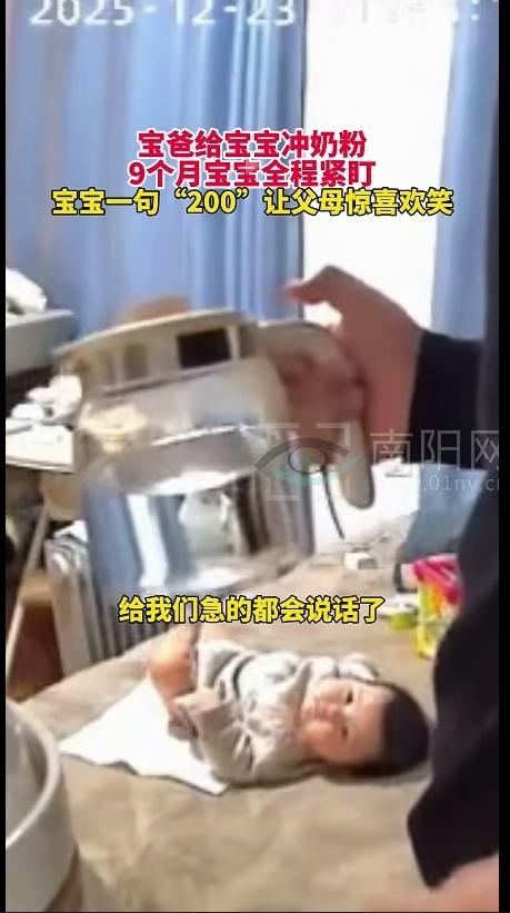 科学也解释不清楚了!宝爸给9个月的宝宝冲奶粉,宝宝全程紧盯最后,宝宝喊出“200”,让父母既惊喜又意外。网友:孩子的每一次开口,都是父母最甜的惊喜 12月23日晚上,北京一个宝爸正在给孩子冲奶粉,家里9个月的小奶娃躺在旁边,眼睛瞪得贼拉圆,一眨不眨盯着爸爸的手,冷不丁冒出一句“200”,把夫妻俩惊得半天没回过神,这份意外的惊喜,直接戳中了无数网友的心窝子。 当天晚上,宝宝洗完澡正乖乖躺床上等喝奶,宝爸宝妈在旁边小声嘀咕,说这次冲200毫升刚好够娃喝。谁知道这话刚落音,小床上的宝宝突然喊了句“200”。夫妻俩当场就懵了,你看我我看你,愣了好几秒,回过神来俩人笑得直不起腰。 宝爸一边笑一边打趣:“好家伙,合着是我俩磨叽,给娃都急得会说话了!” 视频里的小宝宝,圆滚滚的大眼睛死死盯着冲奶粉的爸爸,小胳膊小腿规规矩矩摆着,那副眼巴巴等奶喝的馋样,配上突然冒出来的“200”,简直萌得人骨头都软了。 而爸妈脸上那种又惊又喜的神情,更是把当爹妈那种藏不住的幸福,展现得明明白白。 其实,养娃这路上,这种暖心的小瞬间多了去了:宝宝第一次费劲巴拉翻身、第一次颤巍巍坐起来、第一次含糊不清喊“爸妈”、第一次说出整句话……这些在旁人看来不值一提的小事,在爹妈眼里,那都是值得记一辈子的里程碑。 就像这个9个月的小家伙,说不定就是听爸妈念叨多了,顺口学了一句,可就这么一句,却让爸妈心里甜滋滋的,瞬间觉得之前熬夜哄睡、换尿布的辛苦,全都值了! 网友们看完视频,评论区直接炸开了锅:“这娃绝对是饿狠了,为了喝口奶连数字都学会了。” 还有的网友说:“太可爱了吧,果然吃货的天赋都是天生的”;” 也有的网友说:“我家娃第一次开口喊妈妈的时候,我当场就掉眼泪了,那种心情,真的只有当爹当妈的才懂”。 是啊,养孩子这事儿,就跟拆盲盒似的,你永远不知道下一秒能撞上啥惊喜。 那些熬夜哄睡的疲惫、半夜爬起来换尿布的折腾、孩子生病时揪心的焦虑,都会在孩子一个甜甜的笑、一句奶声奶气的话里,化成满心的柔软和满足。宝宝的每一点小进步,都是给爹妈最好的礼物。 这个喊出“200”的小宝宝,不光让我们看到了孩子的天真可爱,更让我们读懂了亲子之间最纯粹的美好——孩子在跌跌撞撞长大,父母在小心翼翼陪伴,这份双向奔赴的爱,就是咱们生活里最暖的一束光。 话说,你们家宝宝有没有给你带来不一样的惊喜呢?欢迎大家评论区讨论。