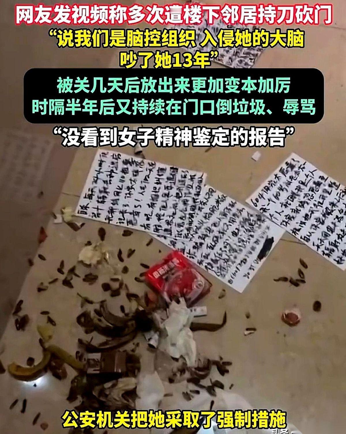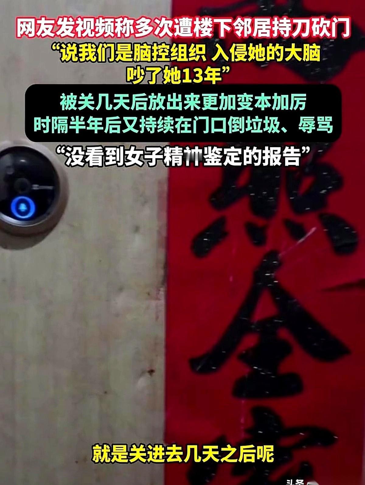 半夜,门外传来“哐哐”的剁门声。 我从监控里一看,魂儿都快吓飞了——楼下那个女邻居,正拿着一把明晃晃的菜刀,一刀一刀往我家门上砍。 就因为她说,我家在用“脑辐射”攻击她,已经攻击了13年。 我真是哭笑不得。 大姐,我这二手房,满打满算才搬进来3年啊! 报警。 警察来了,把她带走,说批评教育。没用。 后来闹得凶了,拘留了几天。 你以为清静了? 不,放出来之后,是噩梦的升级版。 砍门变成了行为艺术,每天的保留节目是往我家门口倒垃圾。 烂菜叶、馊掉的饭、黏糊糊的汤水……你能想到的,想不到的,全都堆在那。夏天那味儿,隔着两层门都往鼻子里钻。 然后就是骂街。 搬个小板凳就坐在我家门口,从祖宗十八代骂到我还没出生的孙子,词儿脏得我都没法跟我老公复述。 物业来了,被她骂走。 邻居见了,绕着道走。 警察再来,也只能两手一摊,劝我们:“别跟她正面冲突,她情绪不稳定。” 我懂。我真的懂。 可家门口就是垃圾场,骂声就是背景音,孩子上学出门都得踮着脚从垃圾堆里找路,我们怎么“不冲突”? 我们一家人,像囚犯一样被“关”在自己花钱买来的房子里。 大人已经快神经衰弱了,晚上一点动静就惊醒。 最让我心疼的是我孩子,本来挺活泼的,现在话都变少了,眼神总是怯怯的。 有一次我问他学校的事,他小声说,不敢请同学来家里玩了。 最近,总算正式立案了,也把她送去精神鉴定了。 可日子,还是一样过。 垃圾照样堆,骂声照样响。 我就想不明白,我们这些只想安安稳稳过日子的普通人,招谁惹谁了? 买一套房,掏空了半辈子积蓄,换来的不是家,是个无形的牢笼。 这日子,什么时候才是个头啊。