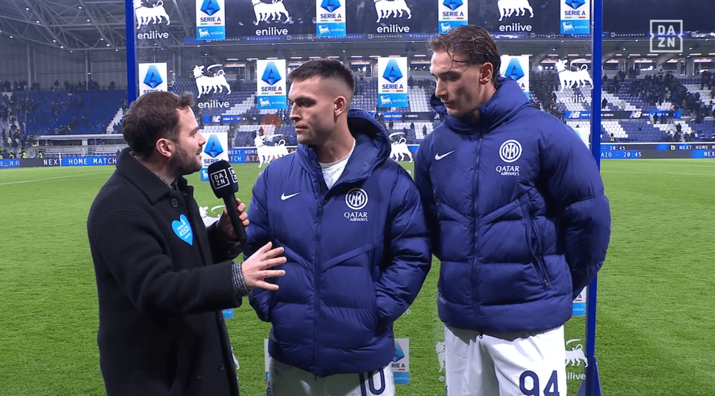 虎扑12月29日讯国际米兰在意甲第16轮客场1-0战胜亚特兰大,国米前锋劳塔罗-马丁内斯在比赛中攻入制胜进球,赛后他与送出助攻的皮奥-埃斯波西托在场边共同接受了转播商DAZN的采访。
