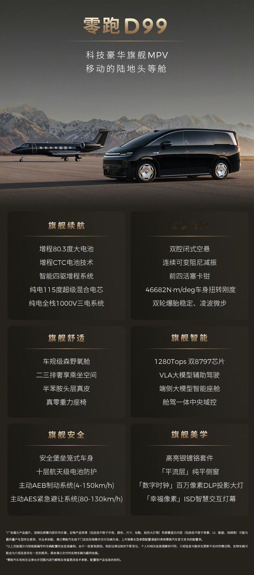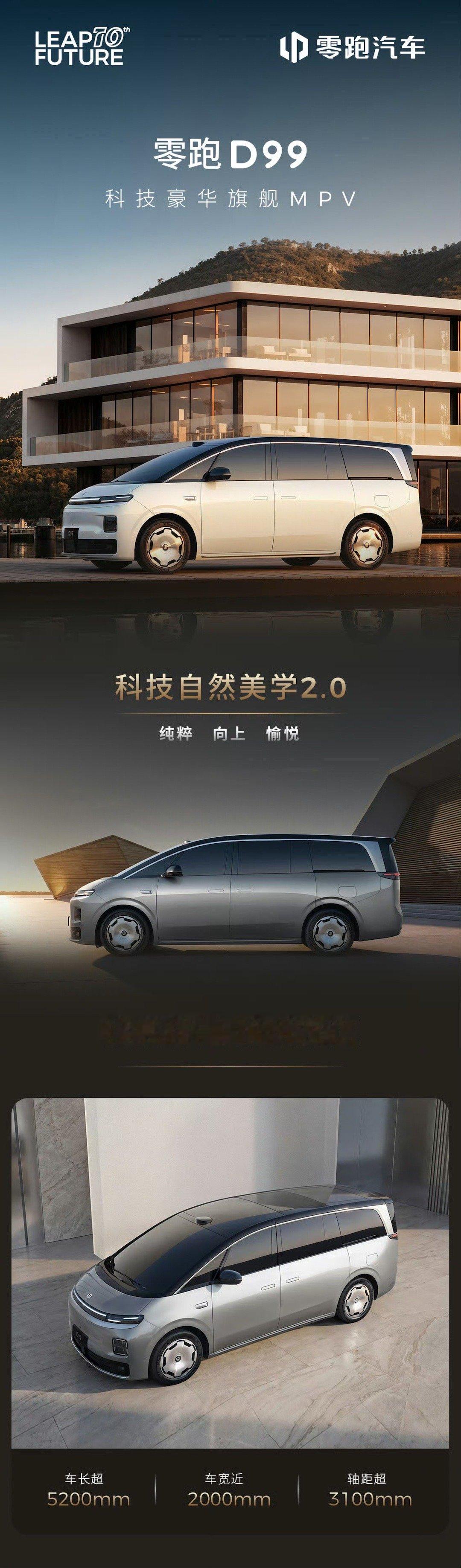 零跑D系列旗舰第二款新产品,零跑D99旗舰MPV硬核参数来了!车身超5米2,轴距超3米1,增程纯电双选择,双腔空悬加持,好开又舒服;零重力真皮座椅,坐享头等舱体验。百万像素DLP大灯+交互灯幕,打造智能光影;笼式车身搭配十层电池防护,科技与舒适兼得。零跑D99零跑10周年零跑10周年发布会零跑汽车十周年