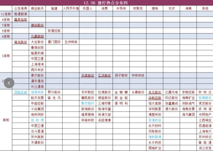 情绪判断:连板股最强的方向主要是在商业航天,没有之一,所以赚钱效应主要在这条线,其他都是小弟弟。机器人,半导体芯片以及光伏锂电储能这边开始低位崛起,这是后续承接的方向,也要重视。情绪上涨周期,重板块重个股阶段又开始了,忽略指数的影响。 周五盘前的方向提醒理解基本不变: 操作上: ①商业航天:中线龙头继续持有,已经持有24个交易日,获得12月首个翻倍龙头。投机龙头也是连板,大概率也是一波连板流。 ②光伏储能:碳酸锂切换到光伏储能龙头,因为是方向切换追的,这条线是一季度的核心方向 ③人型机器人:一季度的方向之一 ④CPO光通信方向:还是持有,利润垫比较高,准备是冲最后一波才做出局,新手不玩这条方向。短线上达链操作难度相对较大,轮动补涨的液冷,pcb等也只能追跌杀涨。 ⑤指数方向,主板和科创指数股方向,盈利持仓不动等风来。 ⑥关于有色资源,错过切换期,只能等下一个分歧入口,大宗商品的逻辑很正,继续积极看好。