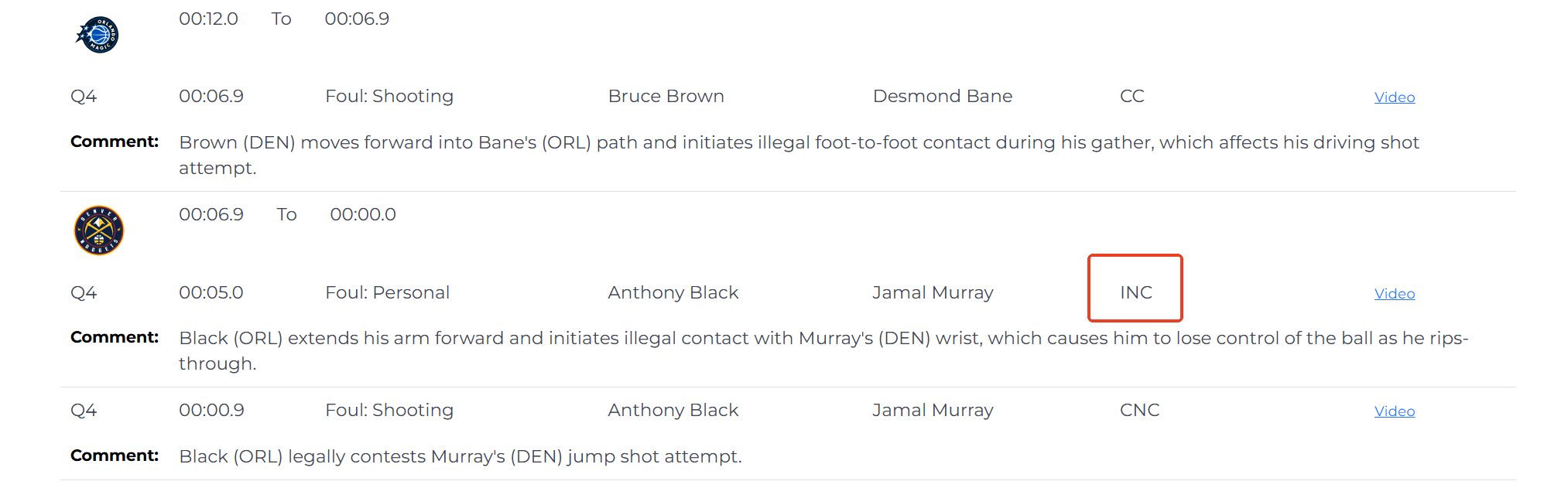 具体内容:布莱克(奥兰多魔术队)伸出手臂,非法触碰到默里(丹佛掘金队)的手腕,导致默里在突破时失去对球的控制。