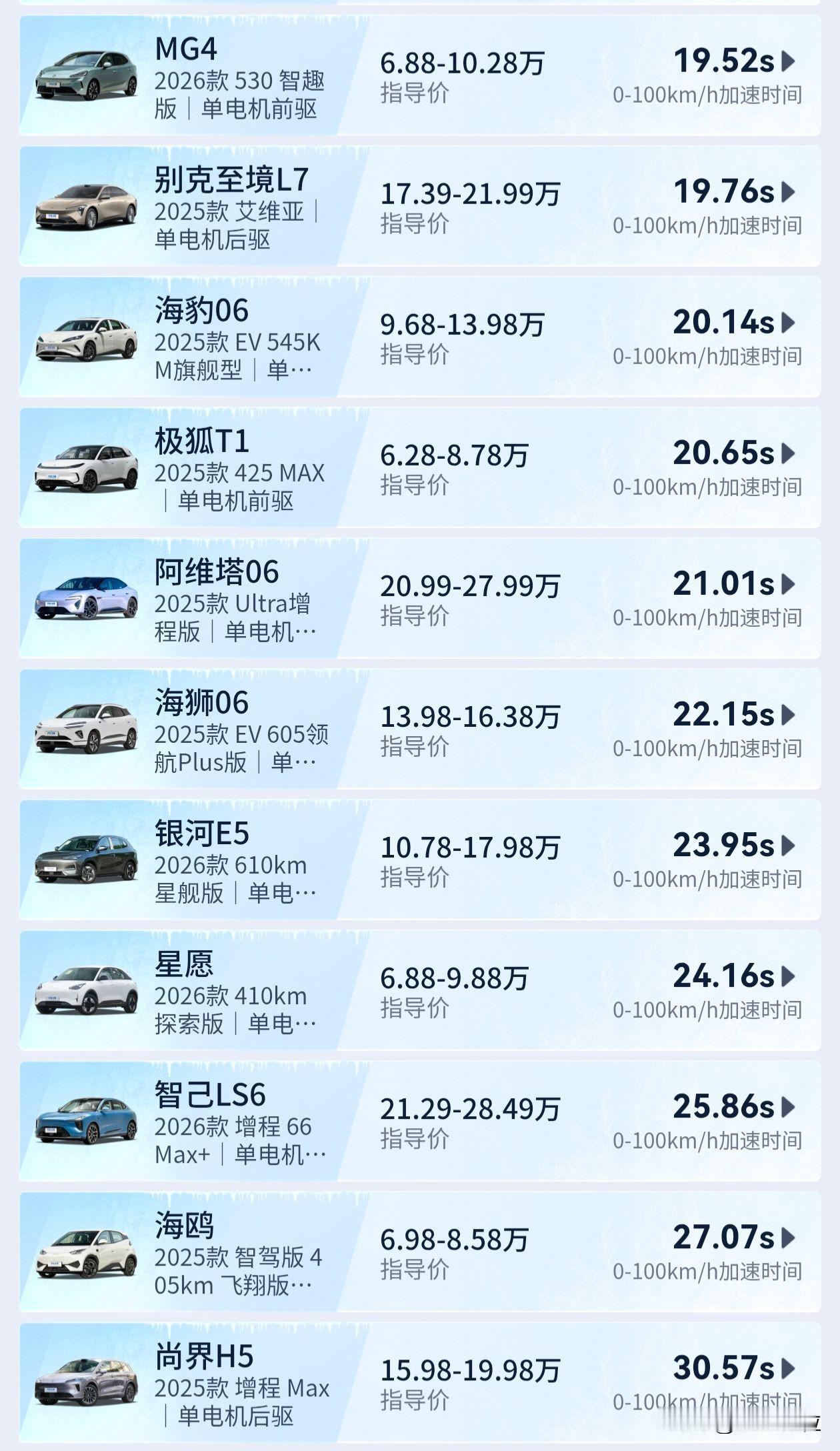 冬季测试,零百加速居然有到30秒的车型,20秒以上的也都是一大堆。这些车在冬天不但是续航不行,加速的折损也太大了吧。这个尚界H5超30秒真让人招笑啊。