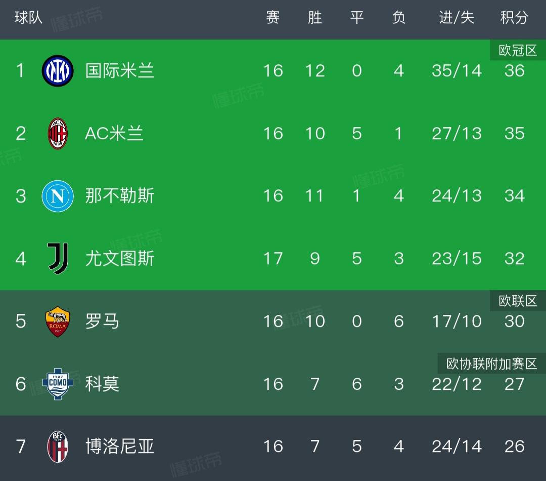 米兰双雄统治下的意甲积分榜。 1国际米兰36分。 2AC米兰35分。 3