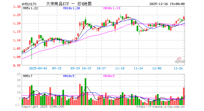 12月26日,大宗商品ETF(510170)涨1.81%,成交额1737.18万元。当日份额减少200.00万份,最新份额为2.59亿份,近20个交易日份额增加1000.00万份。最新资产净值计算值为3.20亿元。