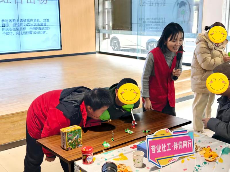 暖场结束后,暖心拼图、筷乐夹物、蛙舌击物、趣味套圈等游戏轮番登场。在挑战拼图速度的环节中,大家齐齐为参与者加油助威;筷乐夹物环节配备了两根巨型筷子,每当有参与者成功夹起玩偶,观众席上便掌声雷动;蛙舌击物游戏里,参与者戴上青蛙嘴巴道具,用力吹出“舌头”击倒目标小物件,那逗趣的模样引得众人捧腹大笑;套圈区域则准备了各式各样的小零食作为奖品,大家玩得不亦乐乎。