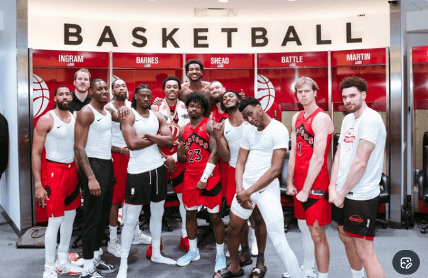 赛后,猛龙全队在更衣室拍摄全家福庆祝胜利,斯科蒂-巴恩斯获得本场最佳球员的大金链子。