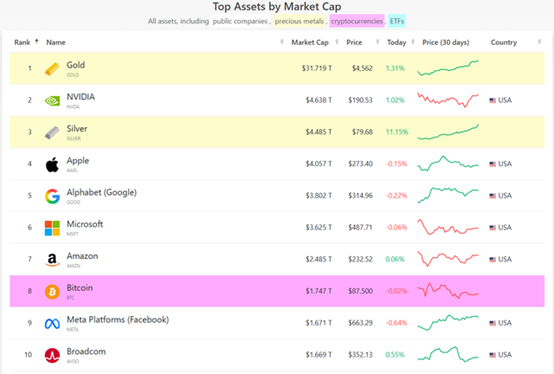 财联社12月29日讯(编辑卞纯)随着白银价格不断攀升,目前该贵金属市值已超越苹果,晋升为全球第三大资产,仅低于黄金和英伟达。