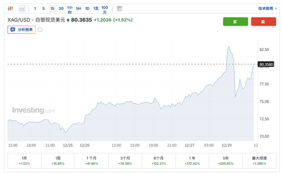 周一,白银市场巨震,上演了“暴涨后急跌”的过山车行情:现货白银开盘暴力拉升,一度上涨逾5%,站上83美元/盎司;随后上演高台跳水,一度跌破75美元,日内振幅达9美元;截至发稿,现货白银价格交投在80美元附近。