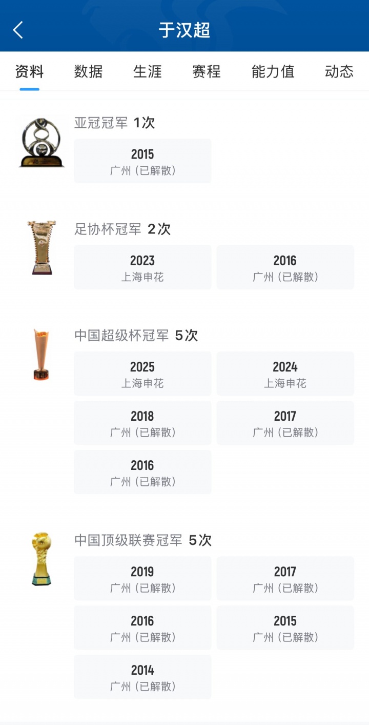 于汉超生涯荣誉:5次中超冠军、1次亚冠冠军,遗憾未随申花夺中超