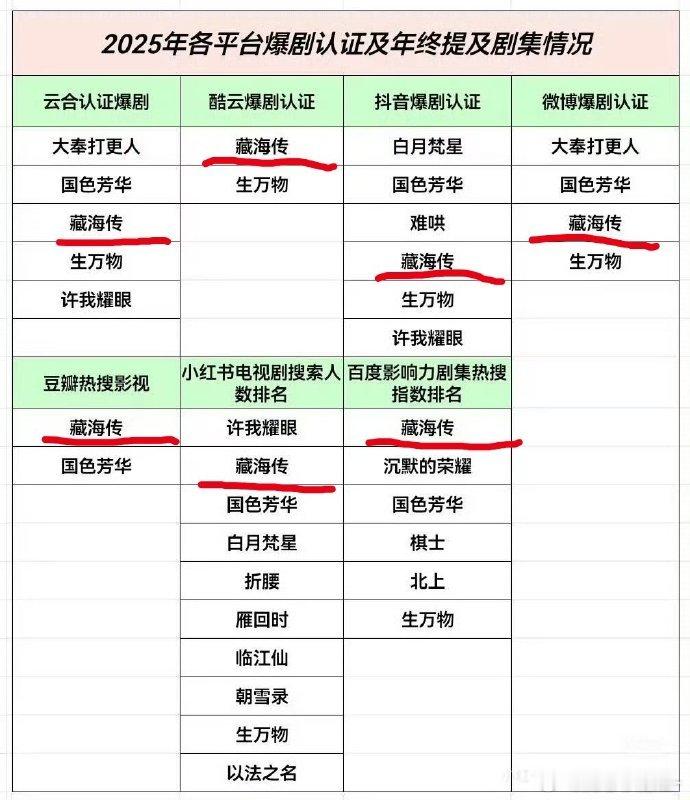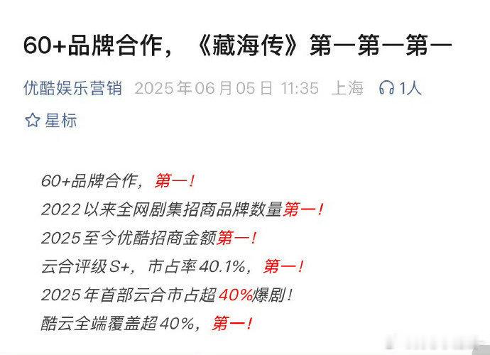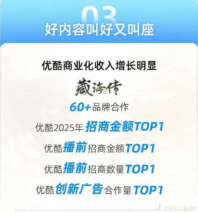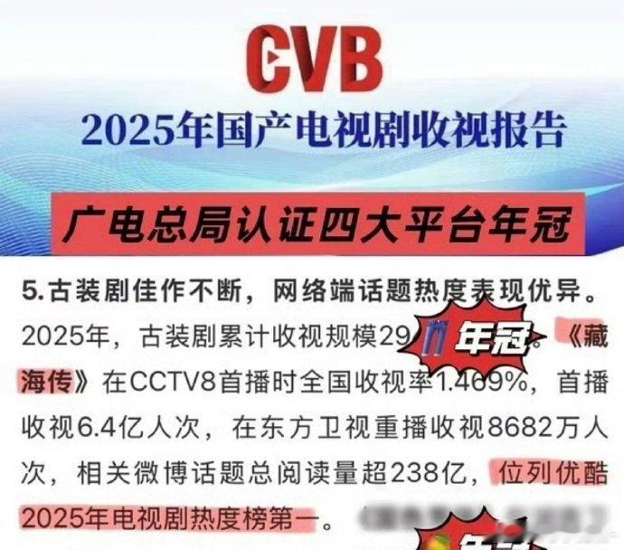 【藏海传2025剧王】1. 全方位大爆,云合、灯塔、猫眼播放量三榜年冠☝️2. 优酷官方认证现象级爆款🔥热度、招商、拉新、收入史冠3. CVB官方认证25年度收视爆款、热度一骑绝尘🔥4. 百度官方年终报告唯一封面剧集演员。25年度影响力第一剧王☝️5. 金莲花唯一最佳电视剧大奖获得者6. 海外IMAD全球百大电视剧25年唯一上榜 7. 小红🍠官方报告藏海传搜索人数、讨论次数优酷第一☝️全平台年亚。